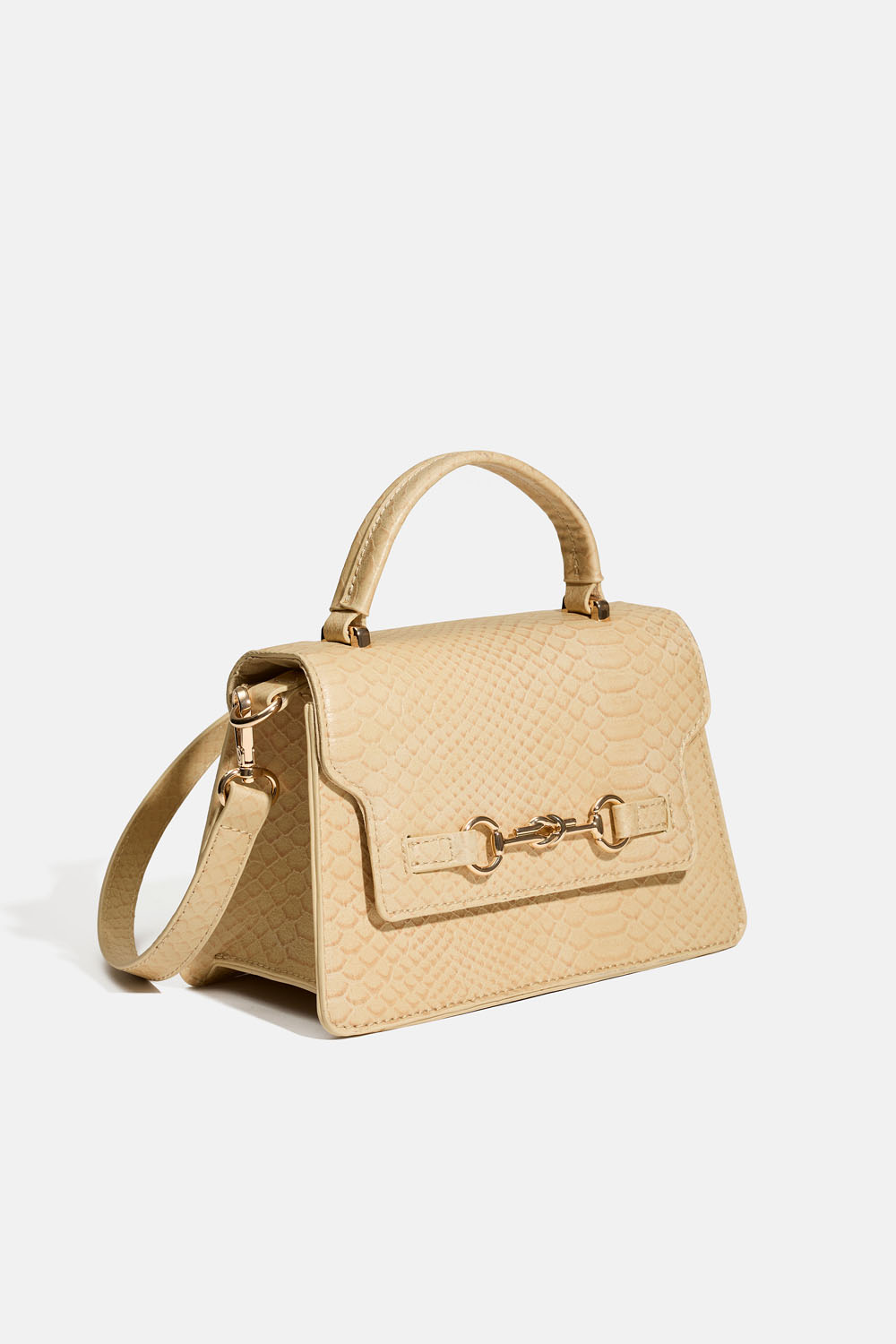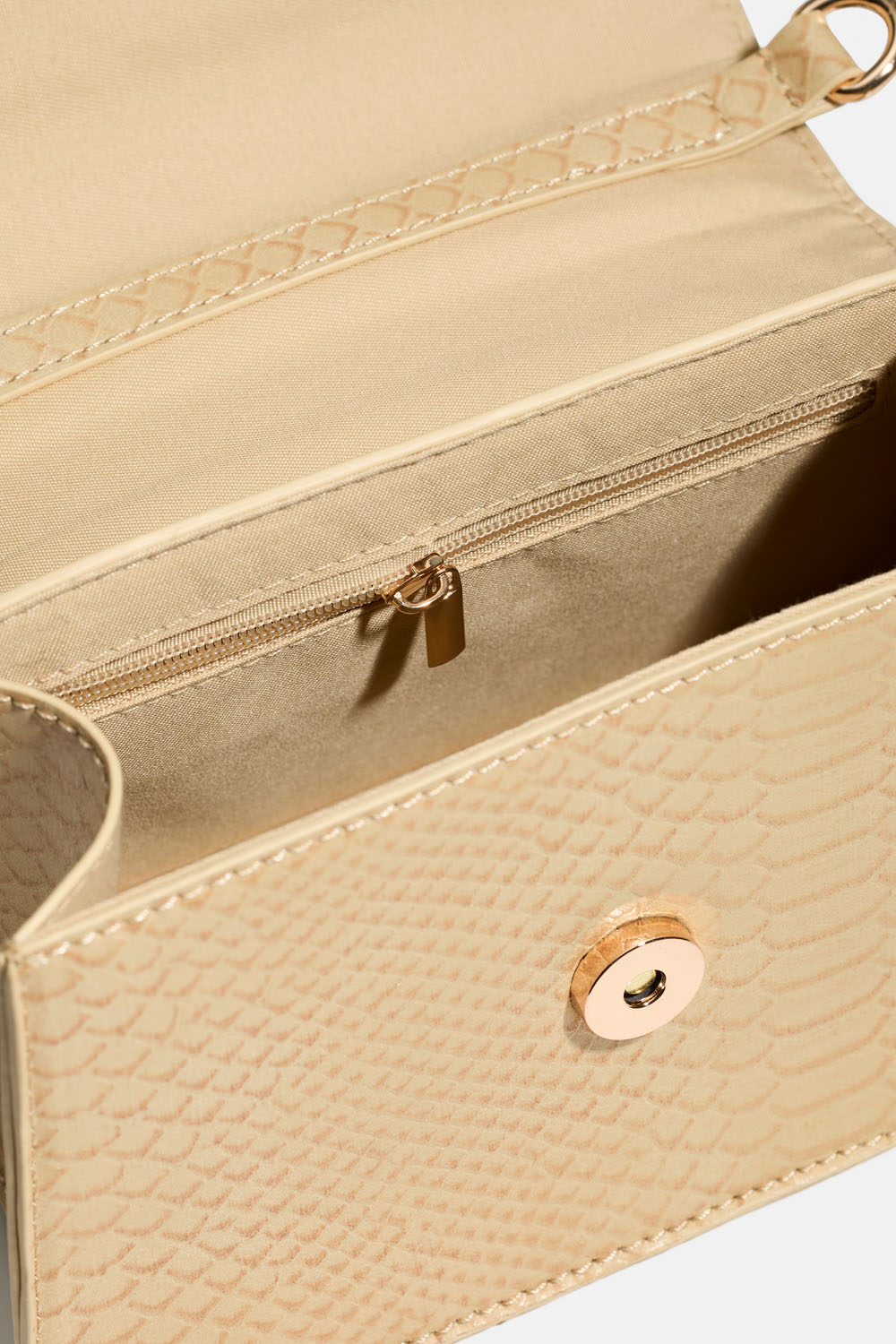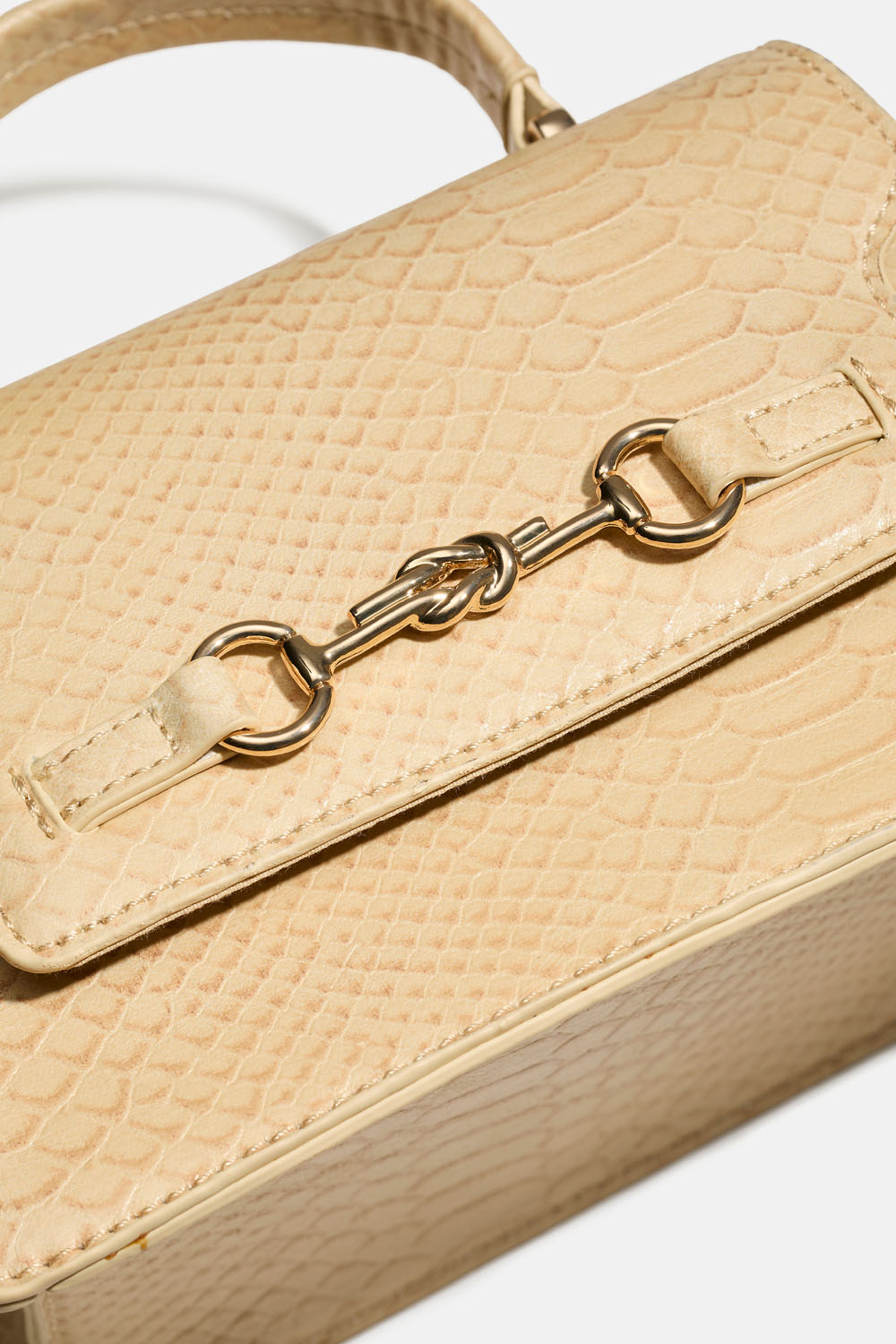Liten väska i beige ormskinnstextur och knop i guldfärgad metall. Väskan stängs med magnet och har ett mindre fack på insidan som stängs med dragkedja. Det medföljer en justerbar axelrem.
