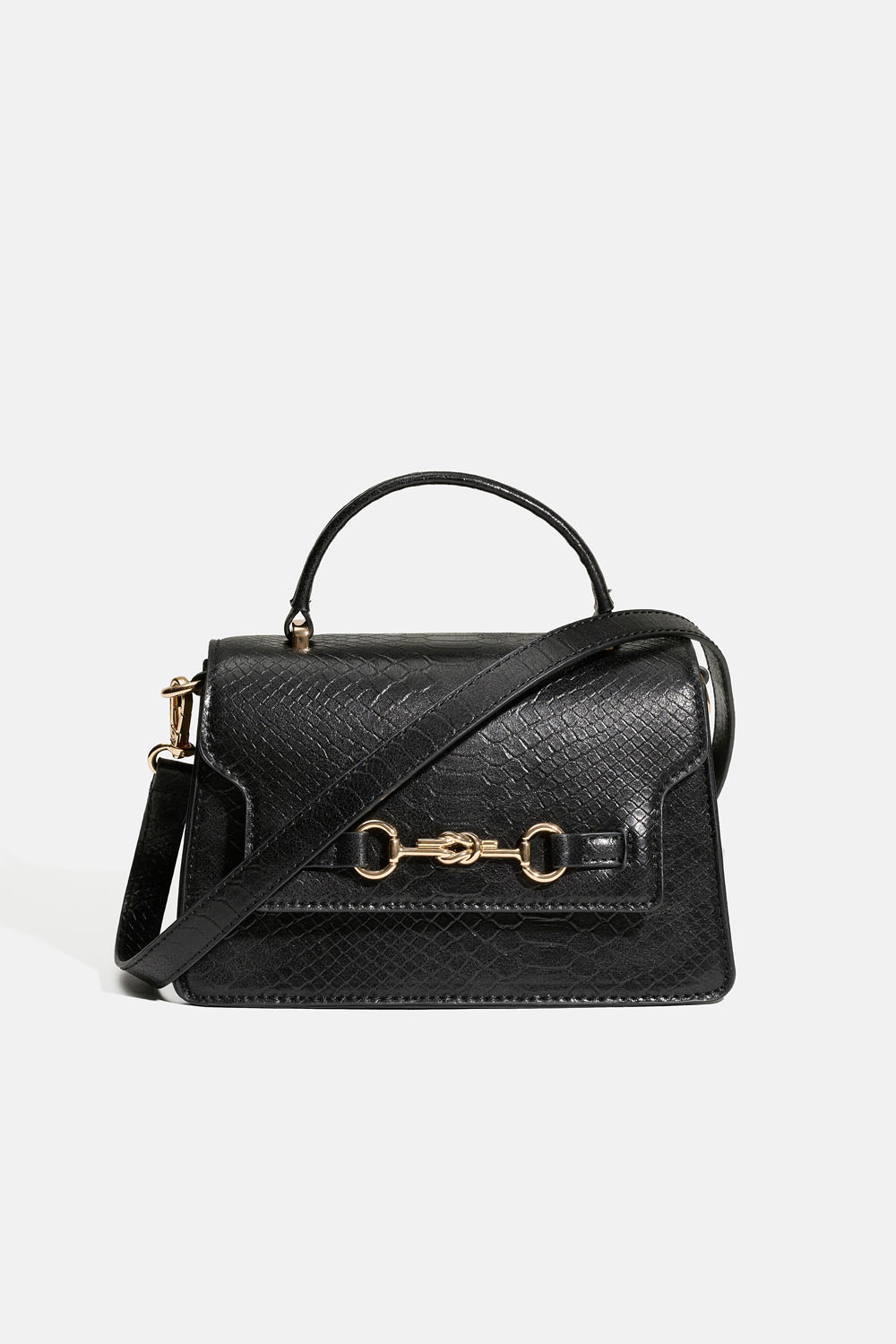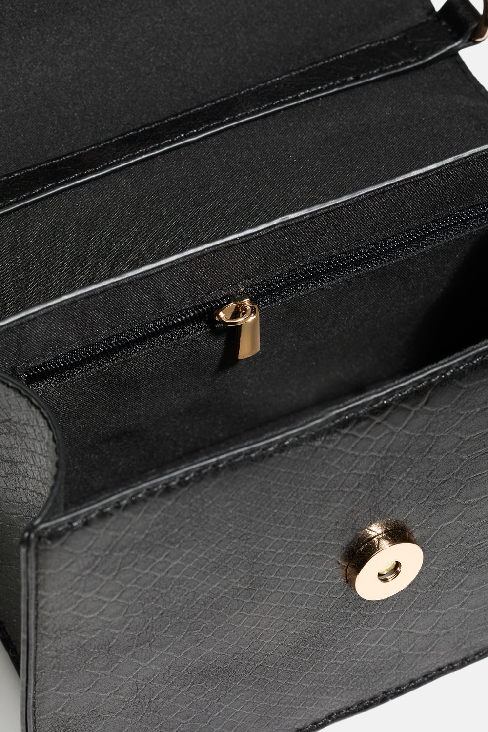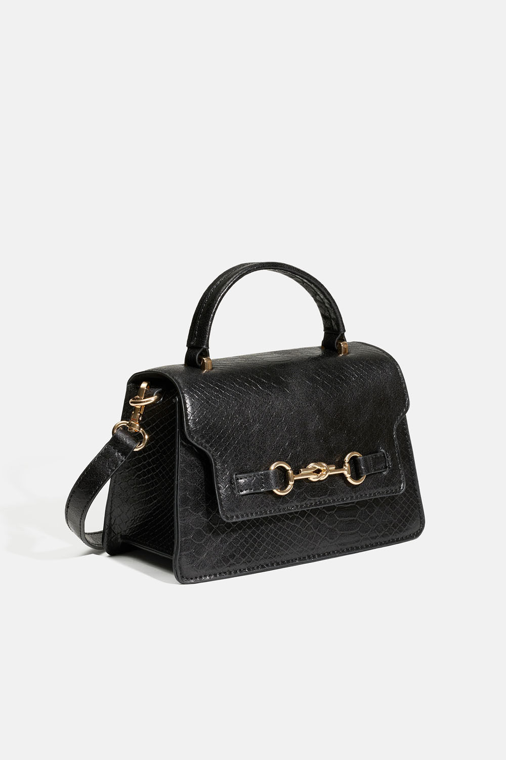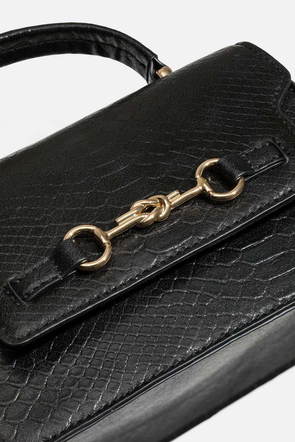 Liten väska i svart ormskinnstextur och knop i guldfärgad metall. Väskan stängs med magnet och har ett mindre fack på insidan som stängs med dragkedja. Det medföljer en justerbar axelrem.