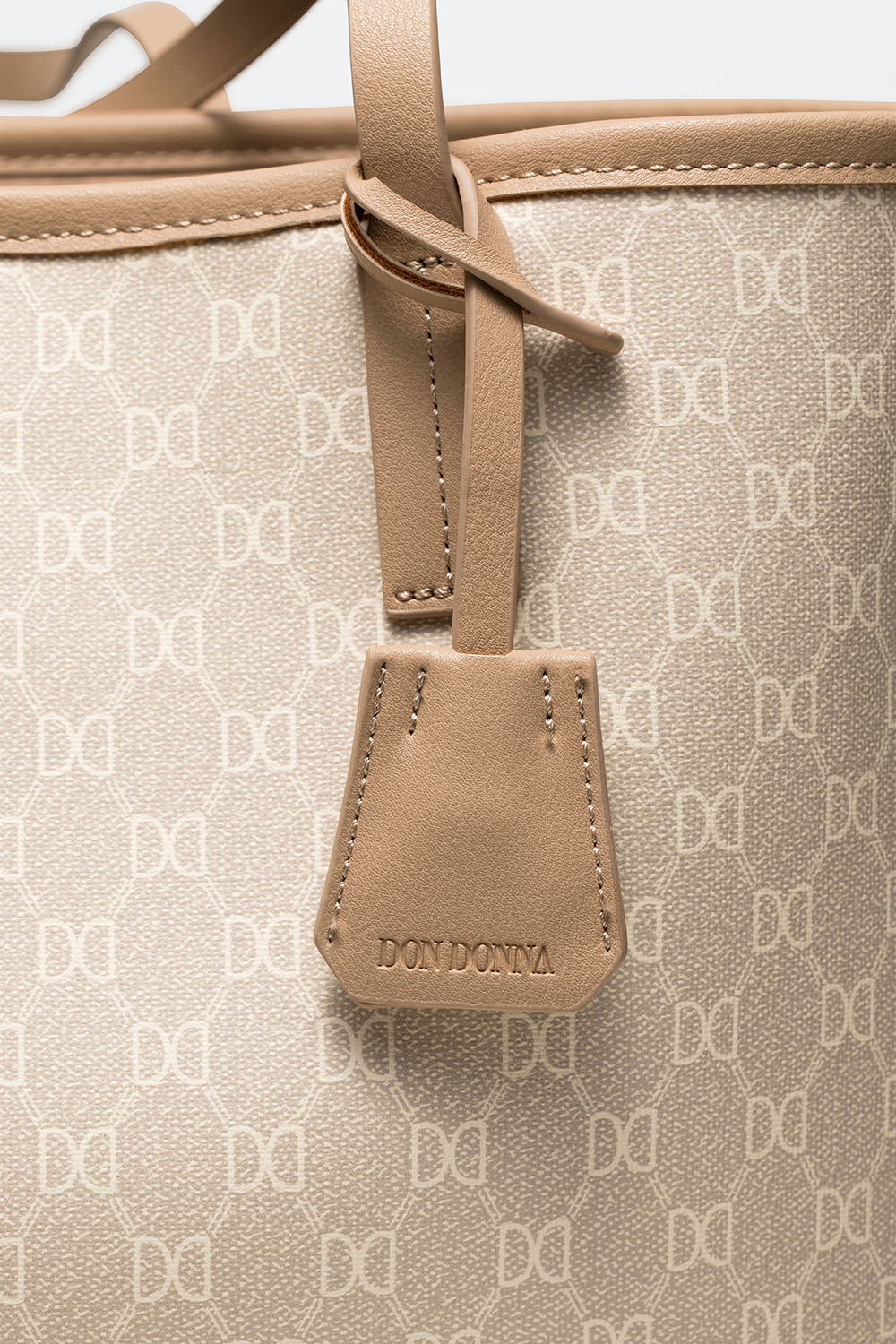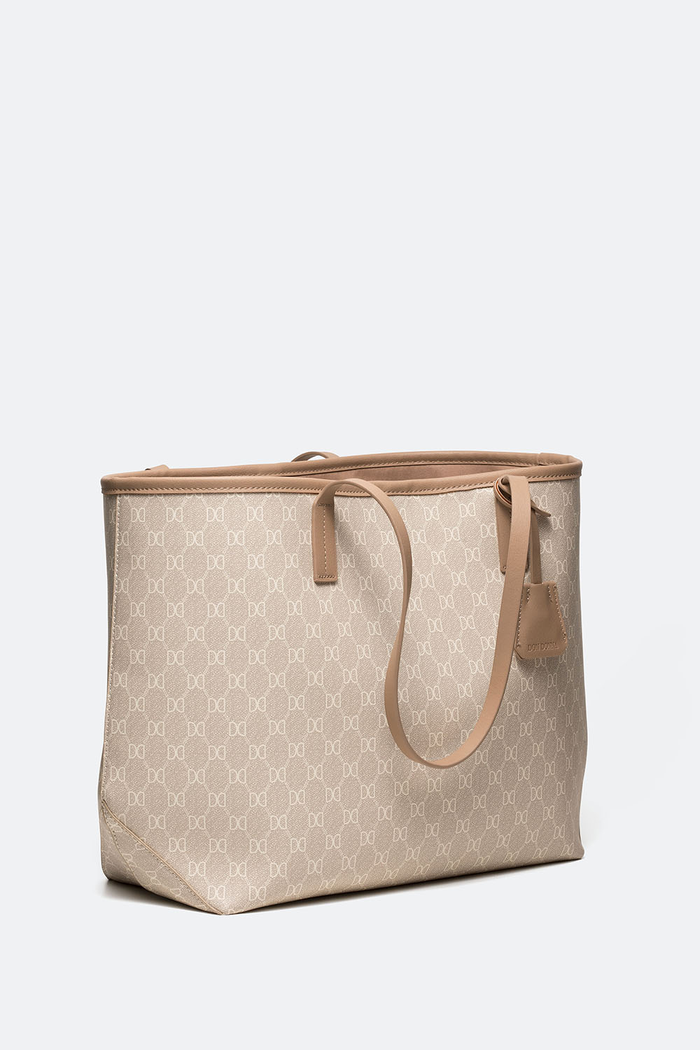 Stor ljusbeige tote bag med Don Donna-loggan printad. En stilren väska med smala handtag som kombinerar mode med funktion med en nyckelring, ett stort fack och två mindre fack innuti. Perfekt vardagsväska och accessoar till jobb och skola med mycket utrymme och smart förvaring.