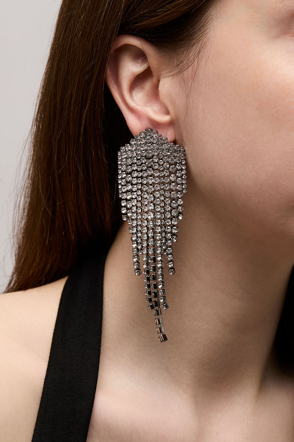 Stora örgängen i grå gun metal färg med kantiga former och hängande små vita glasstenar.