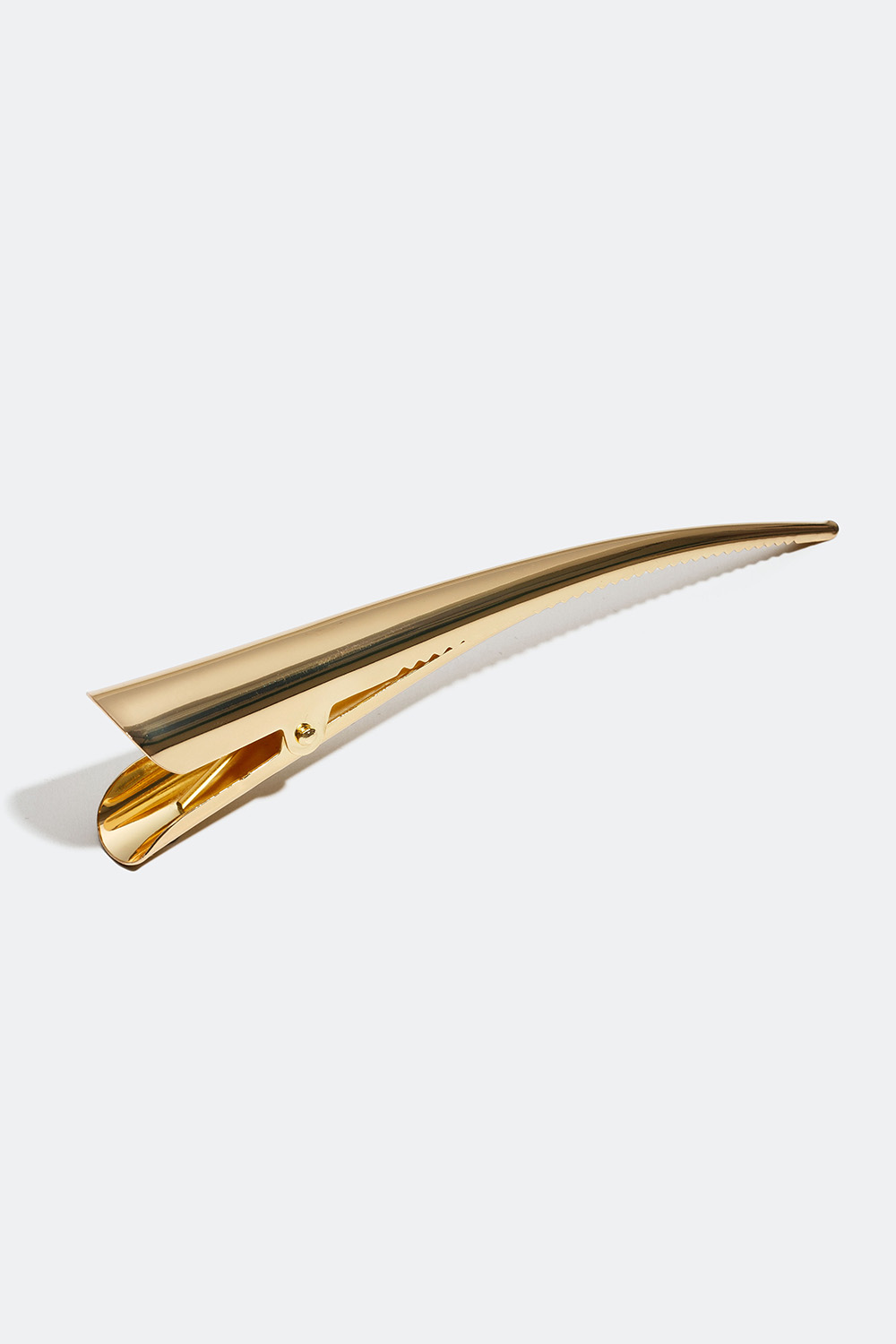 Näbbklämma i metall med blank yta. Denna klämma är perfekt att använda för att både sätta upp hela håret med eller endast vissa sektioner. En stilren näbbklämma som är utformad för att följa formen på huvudet och därigenom fästa bra samt har piggar på ovandelen för bättre fäste.