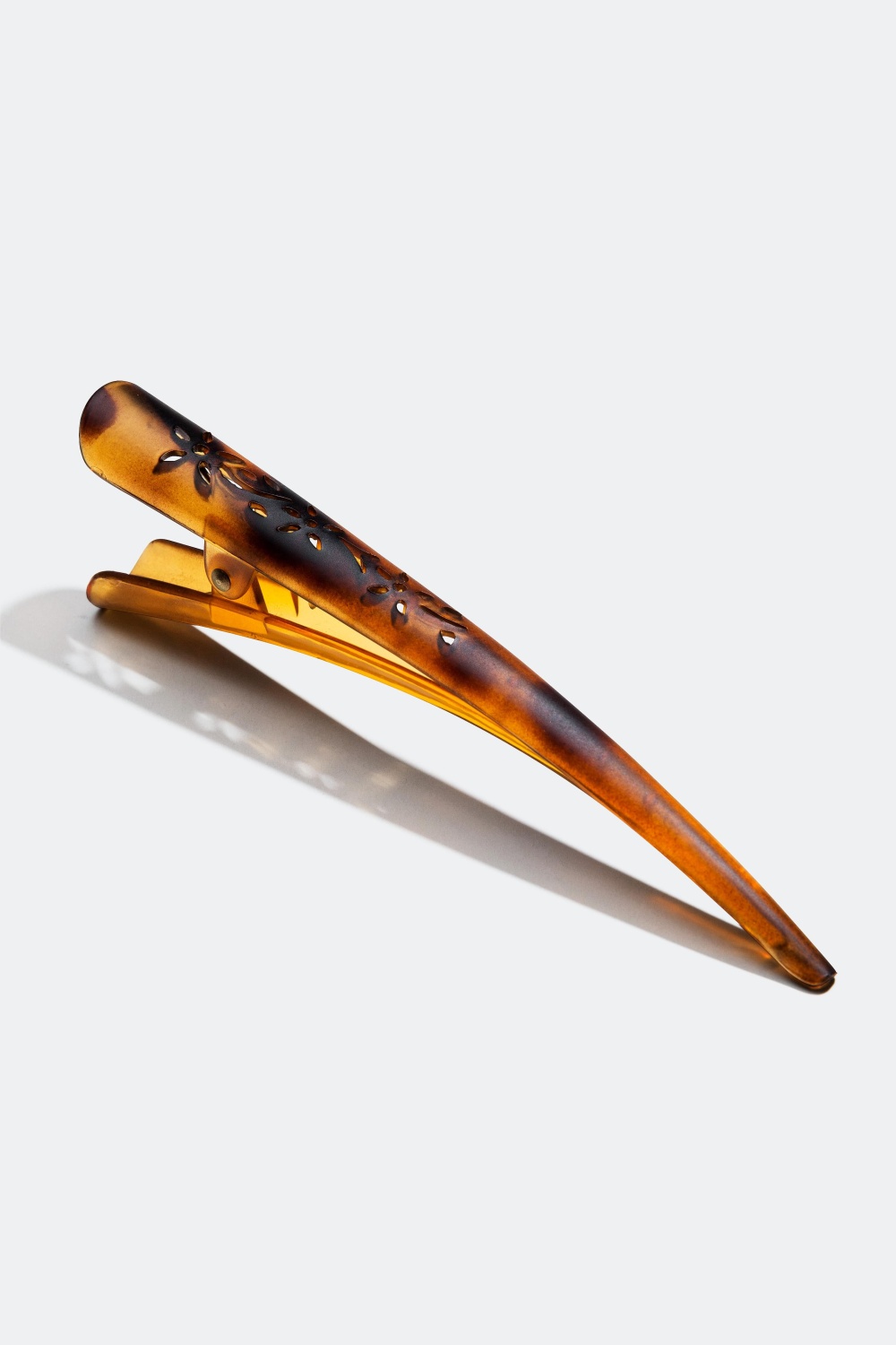 Näbbklämma, perfekt att sätta upp hela eller halva håret med. Ytan på klämman är matt och har ett stansat mönster på ovansidan. Klämman har en design som flöjer formen på huvudet och piggar på insidan som gör att håret fäster bättre.