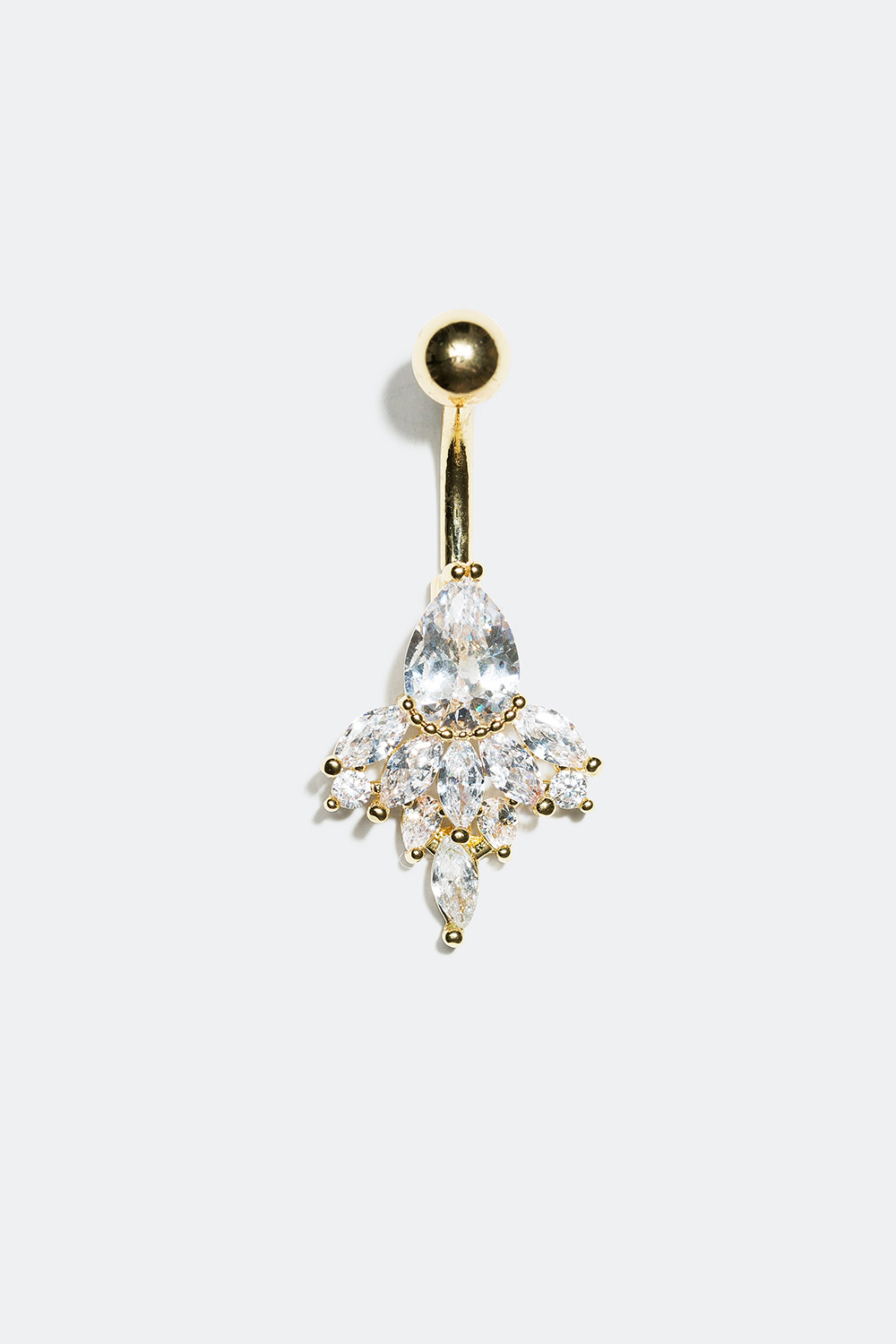 Dekorativ guldfärgad navelpiercing i kirurgiskt stål. Piercingen har ett fint hänge med en större droppformad Cubic Zirconia sten och mindre ovalformade stenar undertill. Piercingstaven och kulan är gjorda av kirurgiskt stål och hänget i mässing.