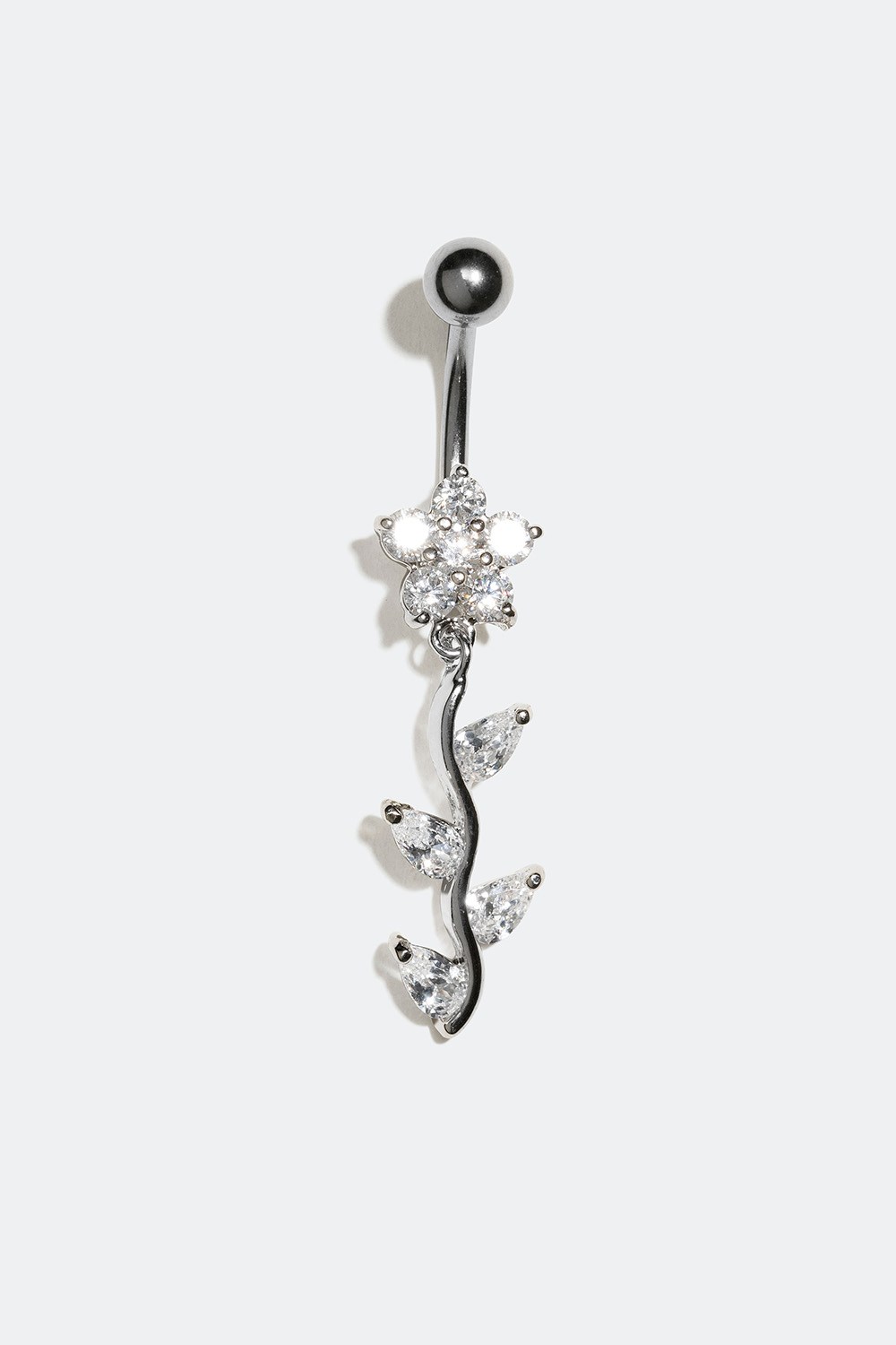 Navelpiercing i kirurgiskt stål med hänge i form av en blomma och blad som är utsmyckad med Cubic Zirconia stenar. Ett dekorativt smycke till naveln med skimrande detalj. Piercingstaven och kulan är gjorda av kirurgiskt stål och hänget som blomman fäster i kommer i mässing.