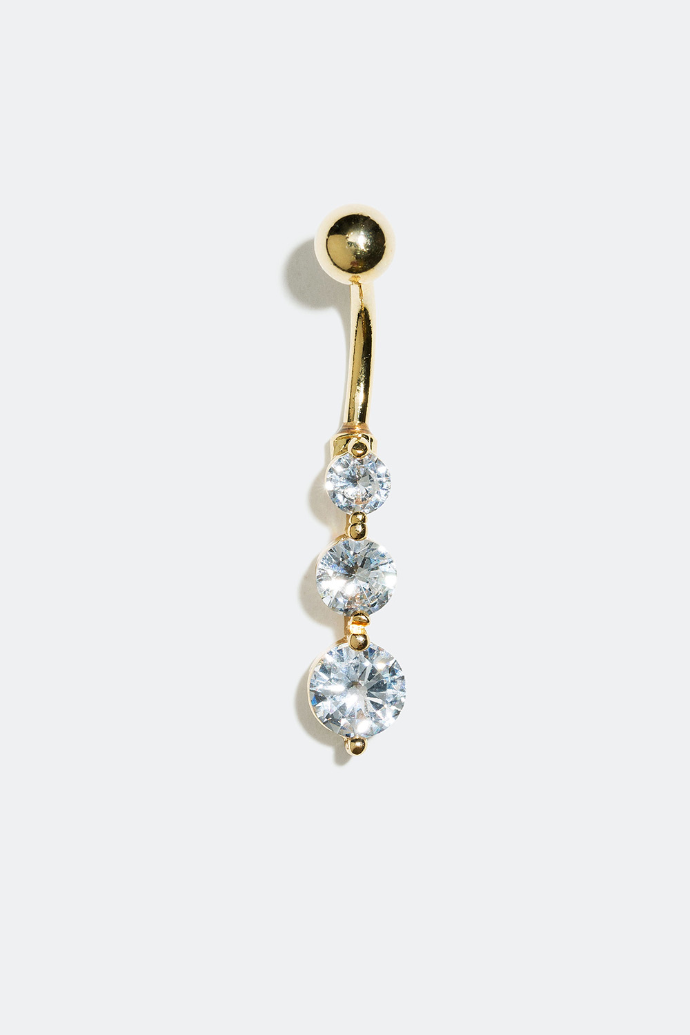 Klassisk navelpiercing i kirurgiskt stål med ett hänge av tre gnistrande Cubic Zirconia stenar i olika storlek. Hänget är inte följsamt utan stenarna sitter fast på ett bakstycke. Piercingstaven och kulan är gjorda av kirurgiskt stål och hänget i mässing.