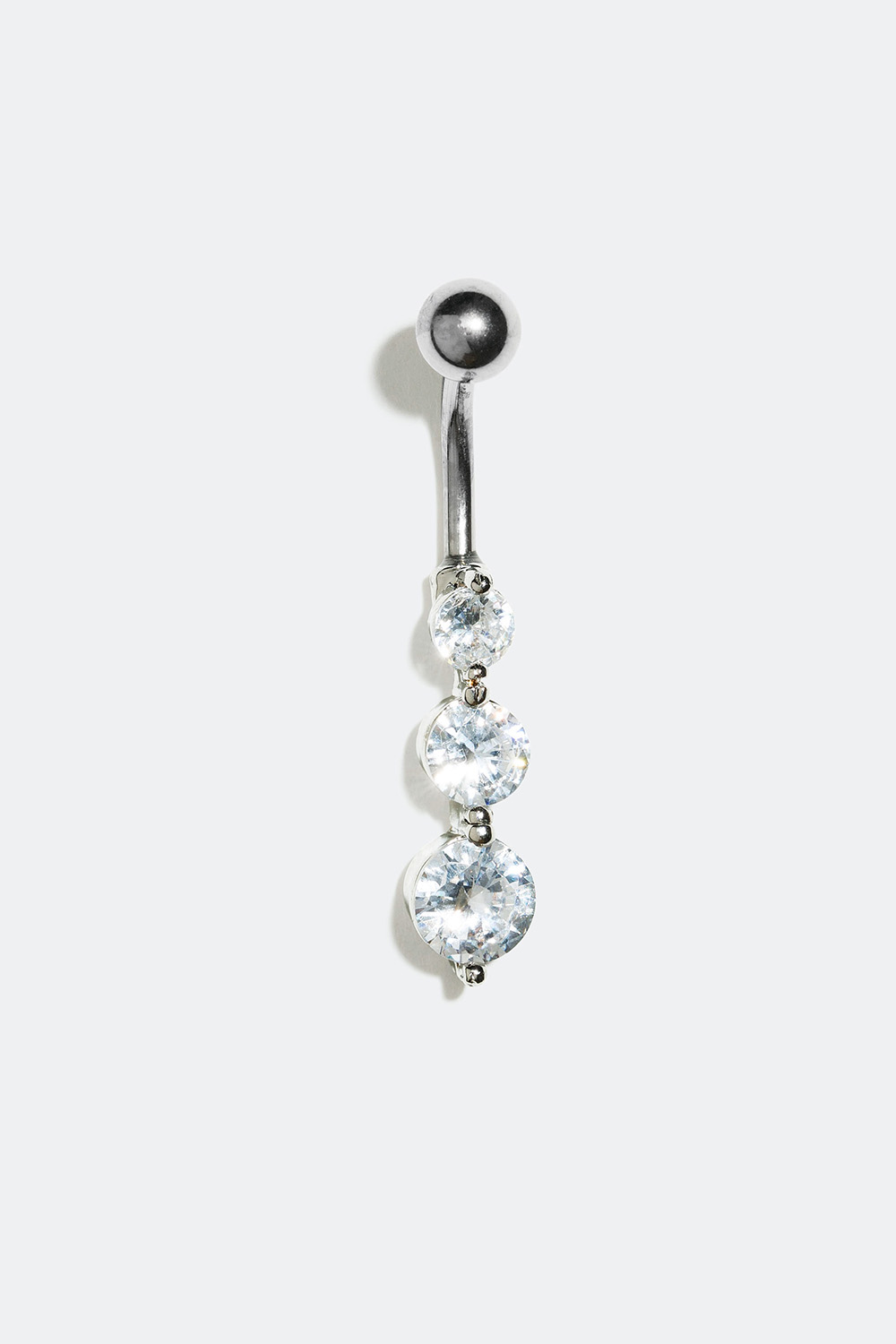 Klassisk navelpiercing i kirurgiskt stål med ett hänge av tre gnistrande Cubic Zirconia stenar i olika storlek. Hänget är inte följsamt utan stenarna sitter fast på ett bakstycke. Piercingstaven och kulan är gjorda av kirurgiskt stål och hänget i mässing.