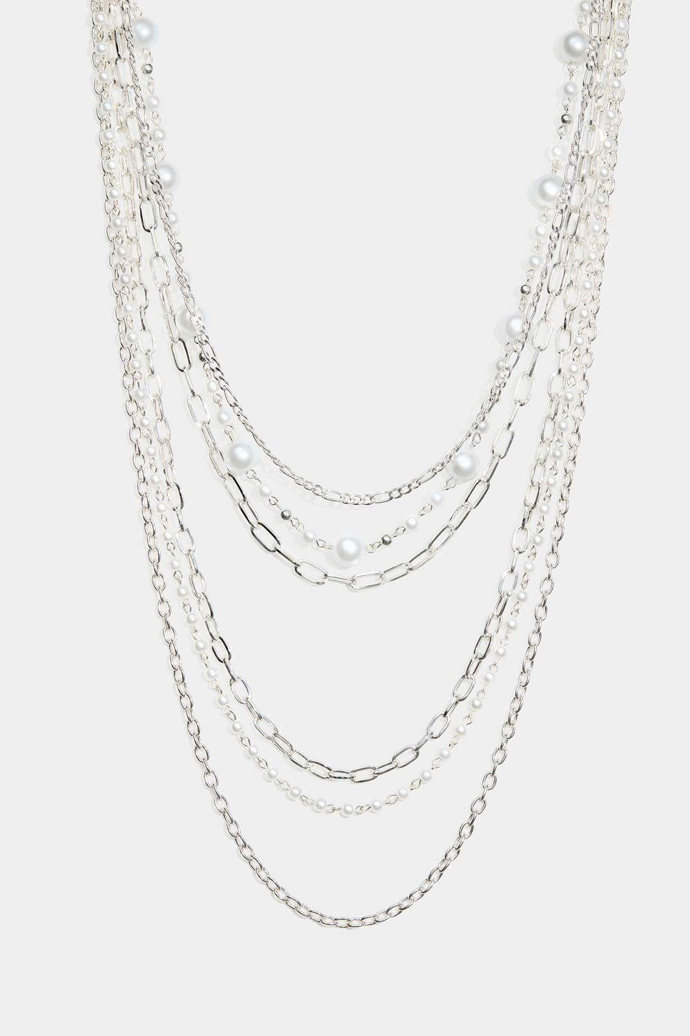 Långt halsband med 6 kedjor i olika design, två dekorerade med vita runda pärlor.