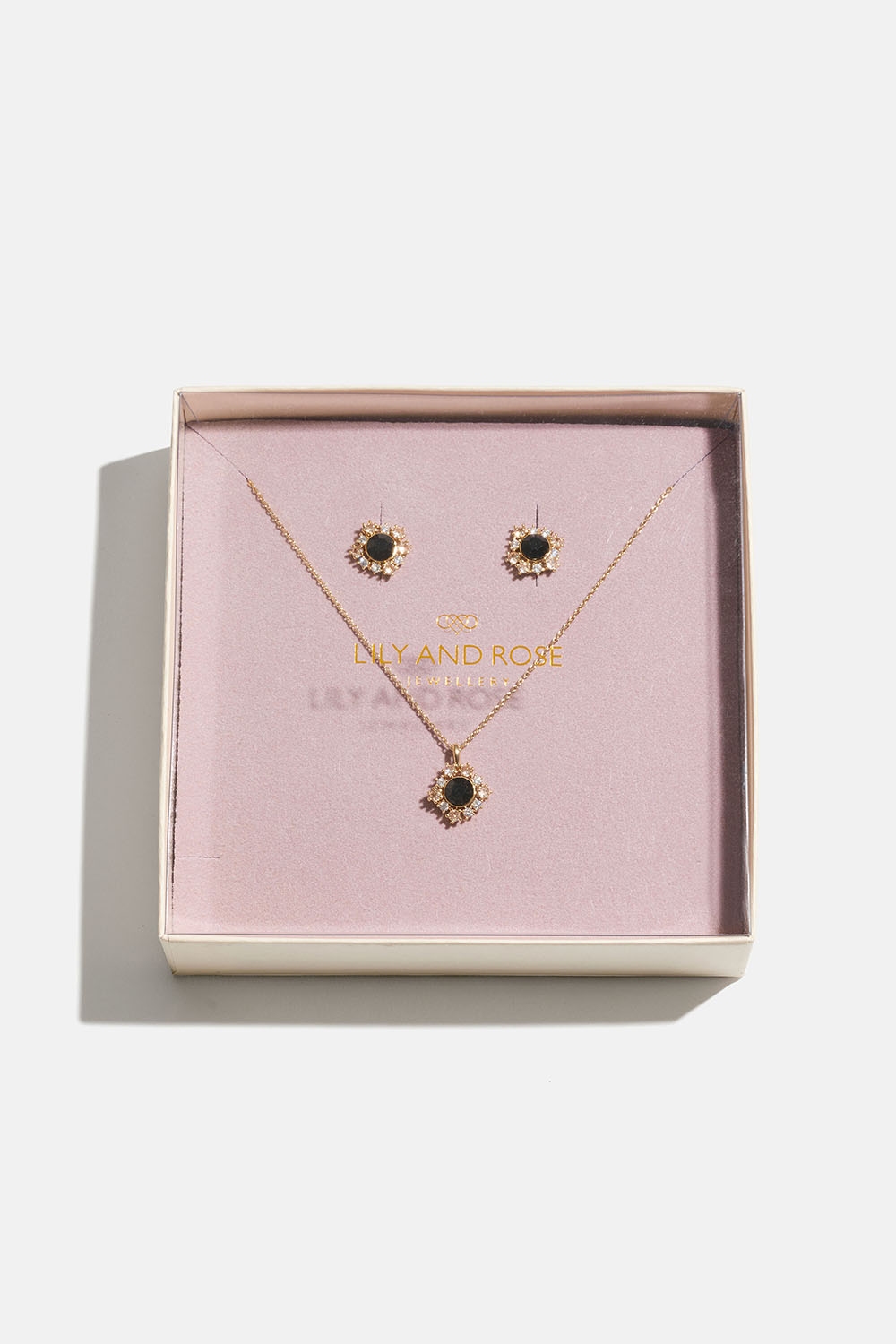 Glowing with light, our Emily necklace and earrings takes an alluring jet black crystal and creates a gorgeous assemblage, using smaller mystical opal and clear crystals. Set in gold. Complete your look with other items from our Emily collection.