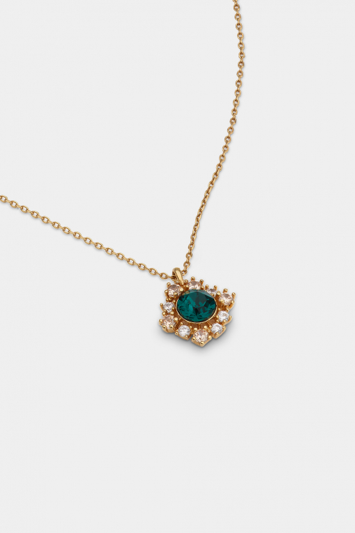 Glowing with light, our Emily necklace takes a stunning emerald stone and creates a gorgeous assemblage using smaller crystals. Set in gold. Complete your look with other items from our Emily collection.