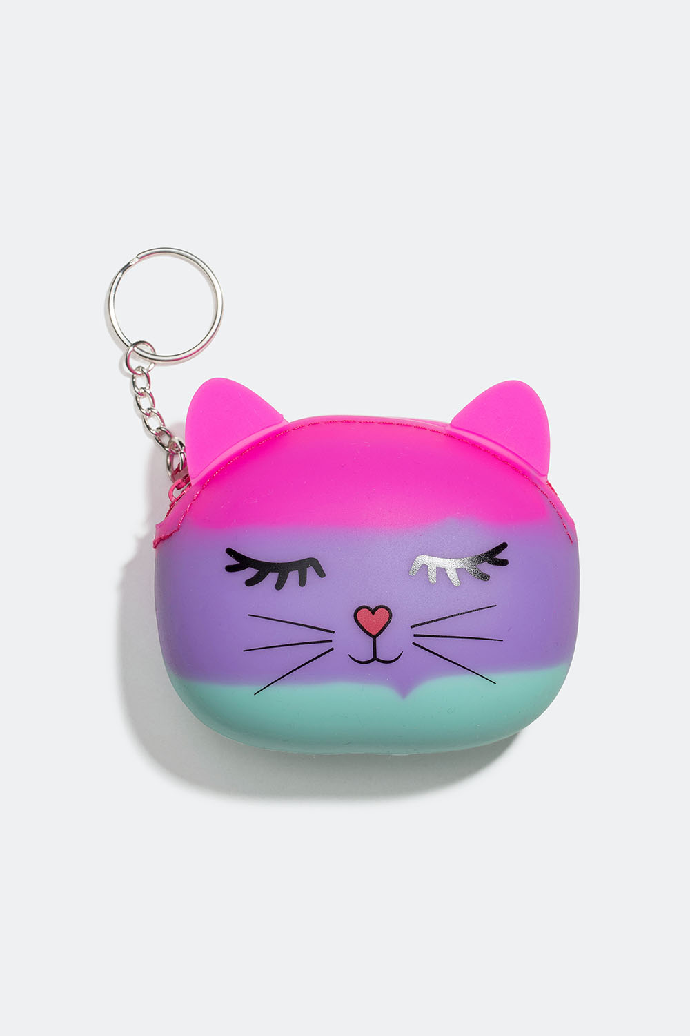 Nyckelring i metall med liten färgglad pouch i silikon med kattmotiv.