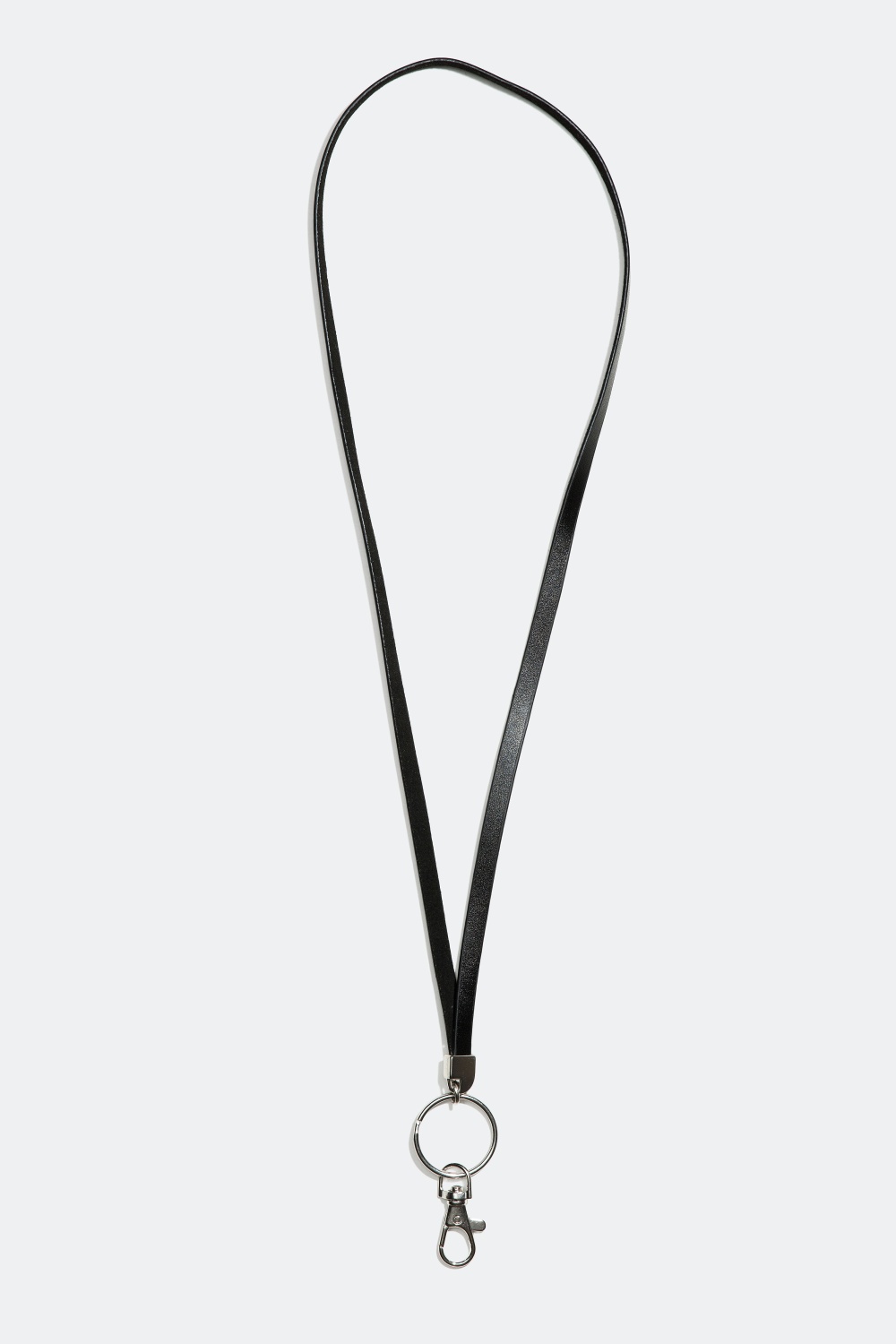 Nyckelring med långt, smalt band i konstläder. Nyckelringen har en karbinhake och en rund nyckelring i metall.