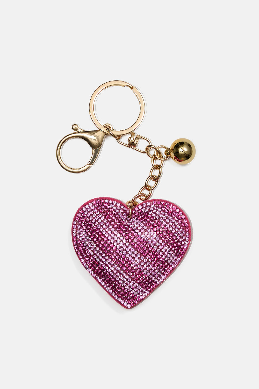 Nyckelring med kedja i guldfärgad metall med liten metallkula och rosa tyghjärta dekorerad med ljus- och mörkrosa glasstenar.