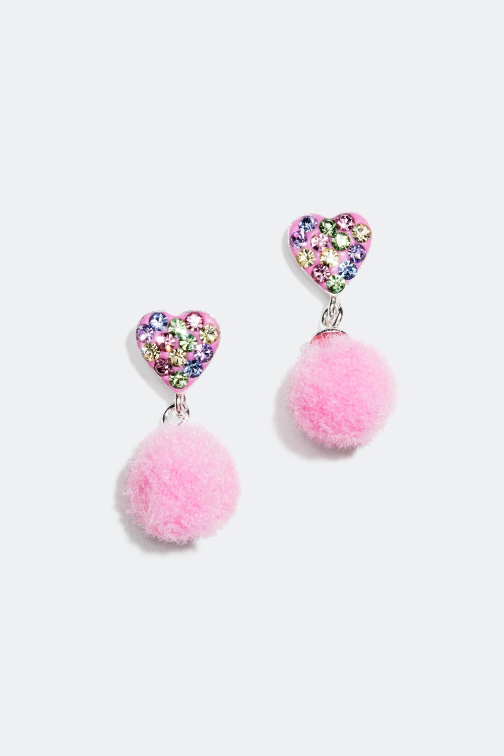 Örhängen i äkta silver med hjärtan dekorerade med strasstenar i olika färger samt en rosa fluffig boll.