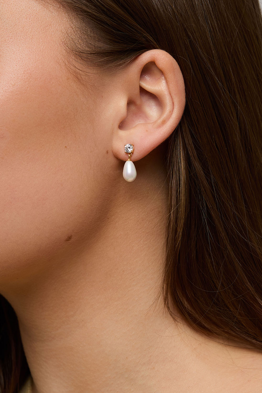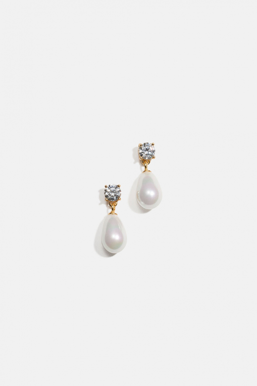 Örhängen i 18k guldpläterat äkta silver med Cubic Zirconia sten och hängande glaspärla.