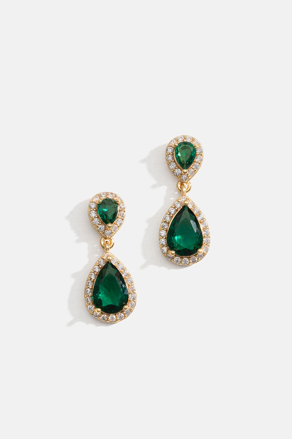 Örhängen i 18k guldpläterat äkta silver med gröna Cubic Zirconia-stenar, formade som droppar med små vita Cubic Zirconia runt om.