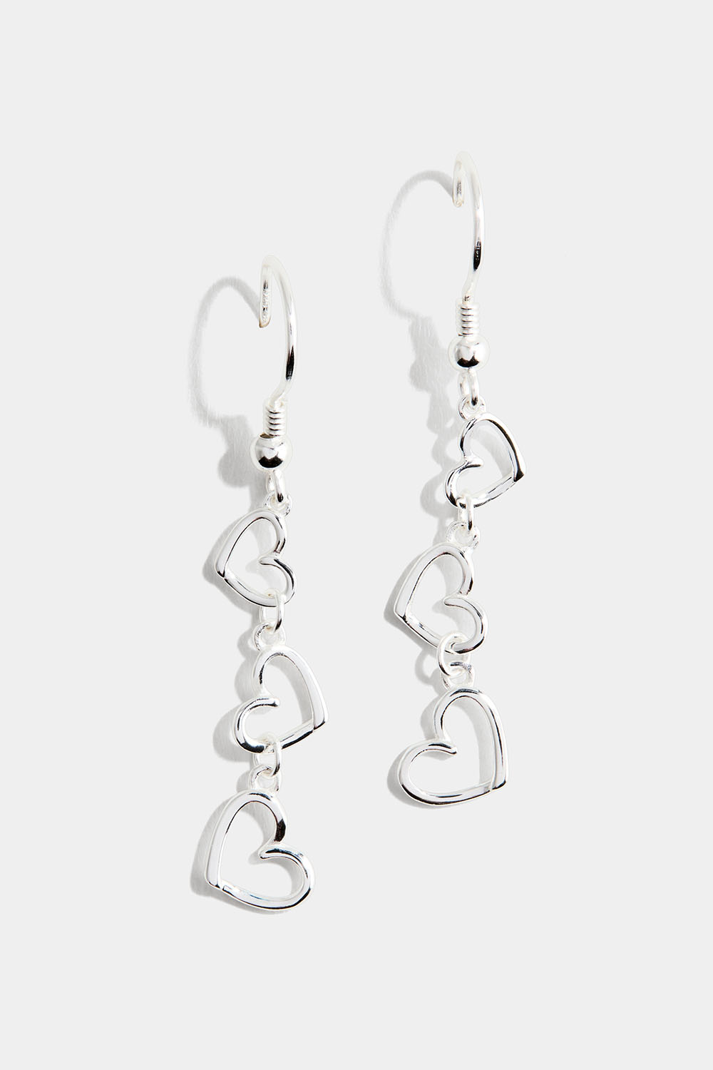 Örhängen med tre hjärtan i olika storlek. Örhängena fästs i örat med en klassisk krok.