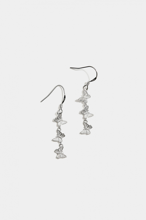 Långa örhängen i äkta silver med tre hängande fjärilar.