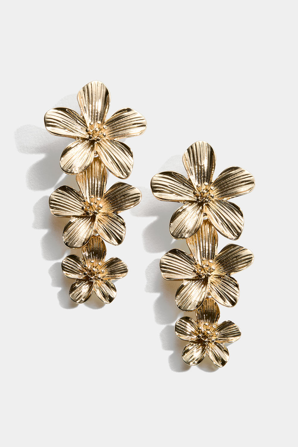 Guldfärgade örhängen i metall med 3 hängande blommor.