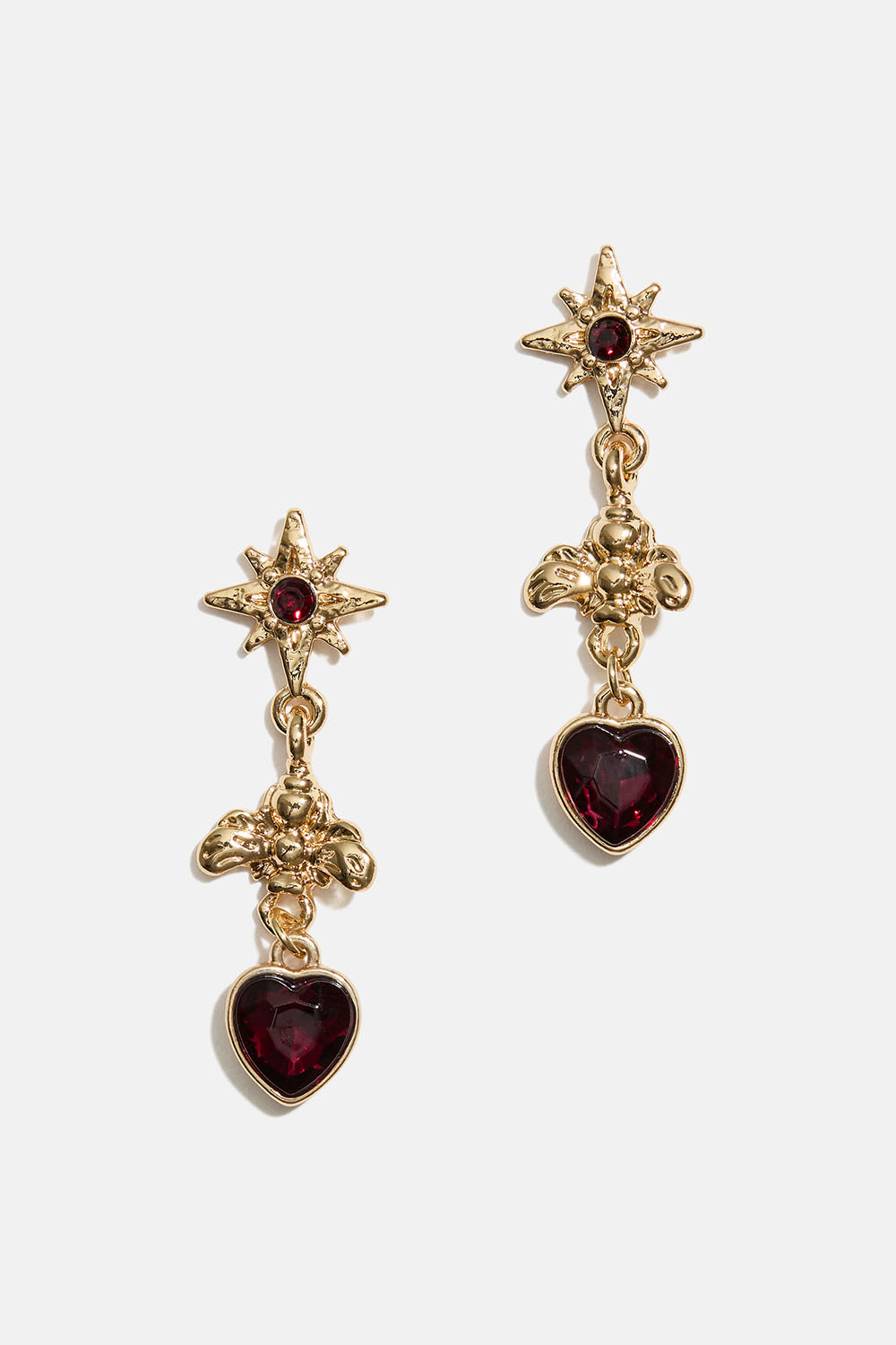 Örhängen i guldfärgad metall med stjärnor, bin och hjärtan dekorerade med röda glasstenar.
