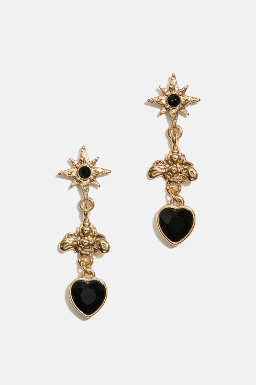 Örhängen i guldfärgad metall med stjärnor, bin och hjärtan dekorerade med svarta glasstenar.