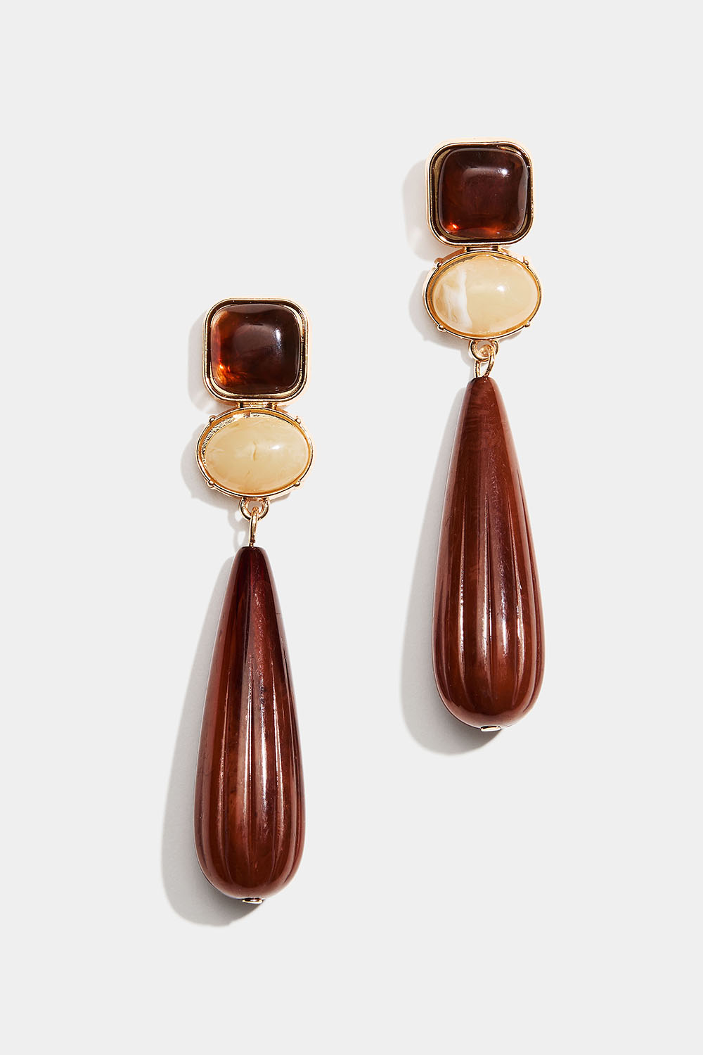 Örhängen i guldfärgad metall med bruna och beiga resinstenar i olika form.