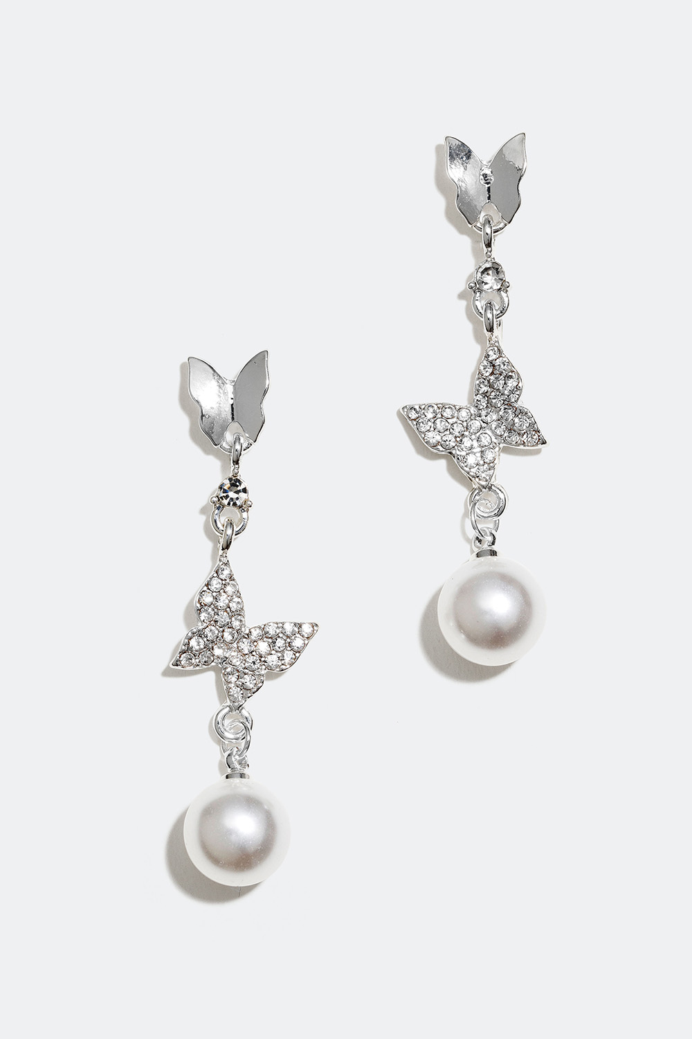 Silverfärgade örhängen med hängande fjärilar och rund pärla, varav den ena fjärilen är utsmyckad med glasstenar. Ett par dekorativa örhängen med skimrande detalj som passar både till vardags och till fest.