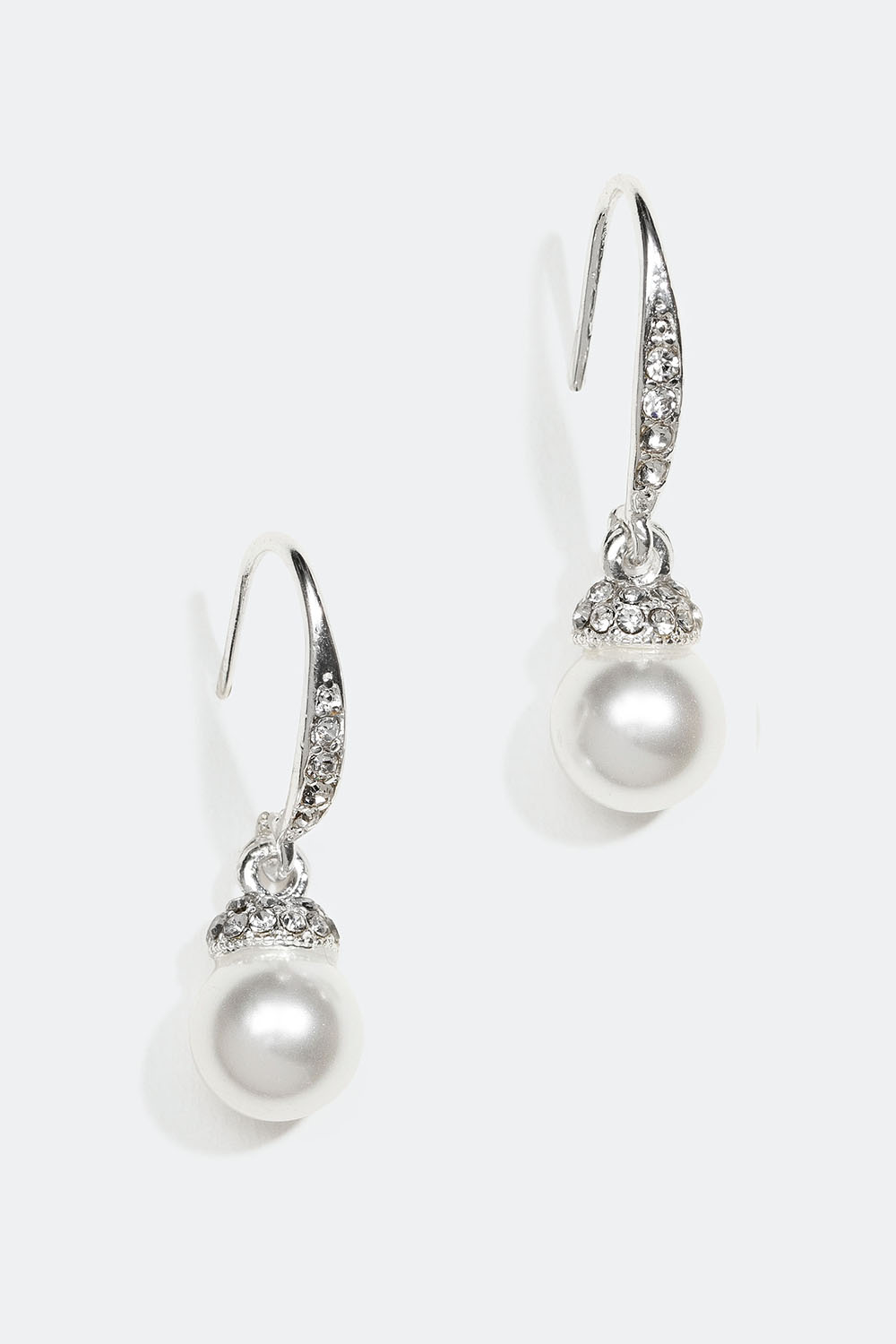 Örhängen som är utsmyckade med skimrande glasstenar och vita glaspärlor.