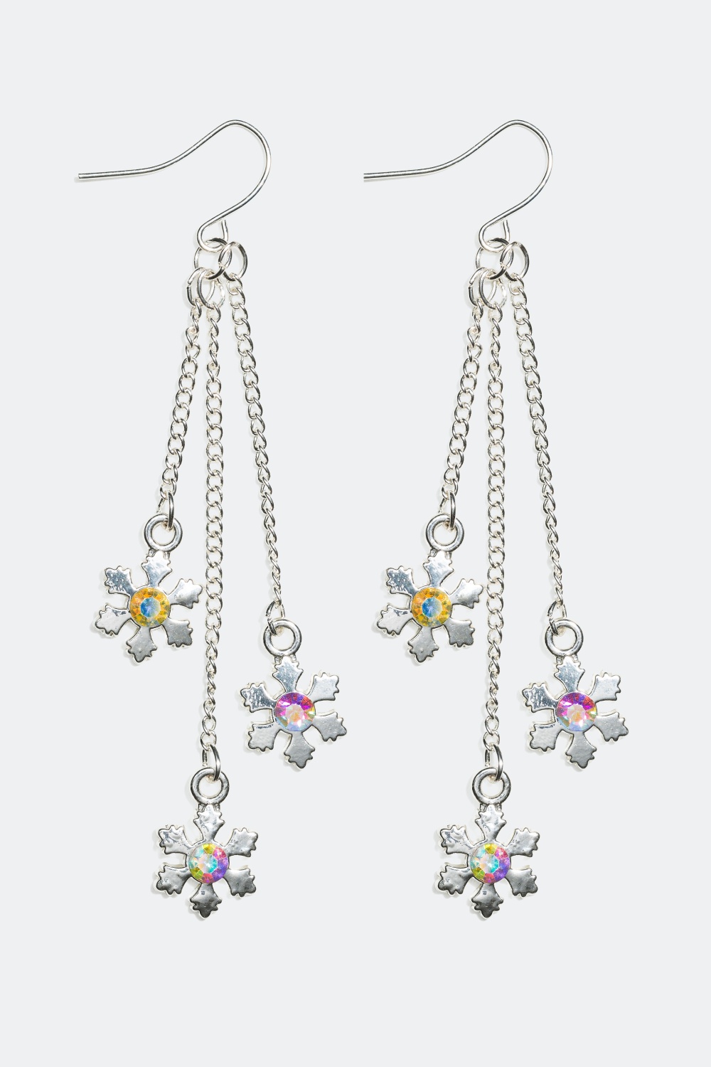 Örhängen med hängande små snöflingor - Ett par metallörhängen, med tre hängande länkar i olika längder med snöflingor på. Snöflingorna är dekorerade med pärlemorskimrande glasstenar.