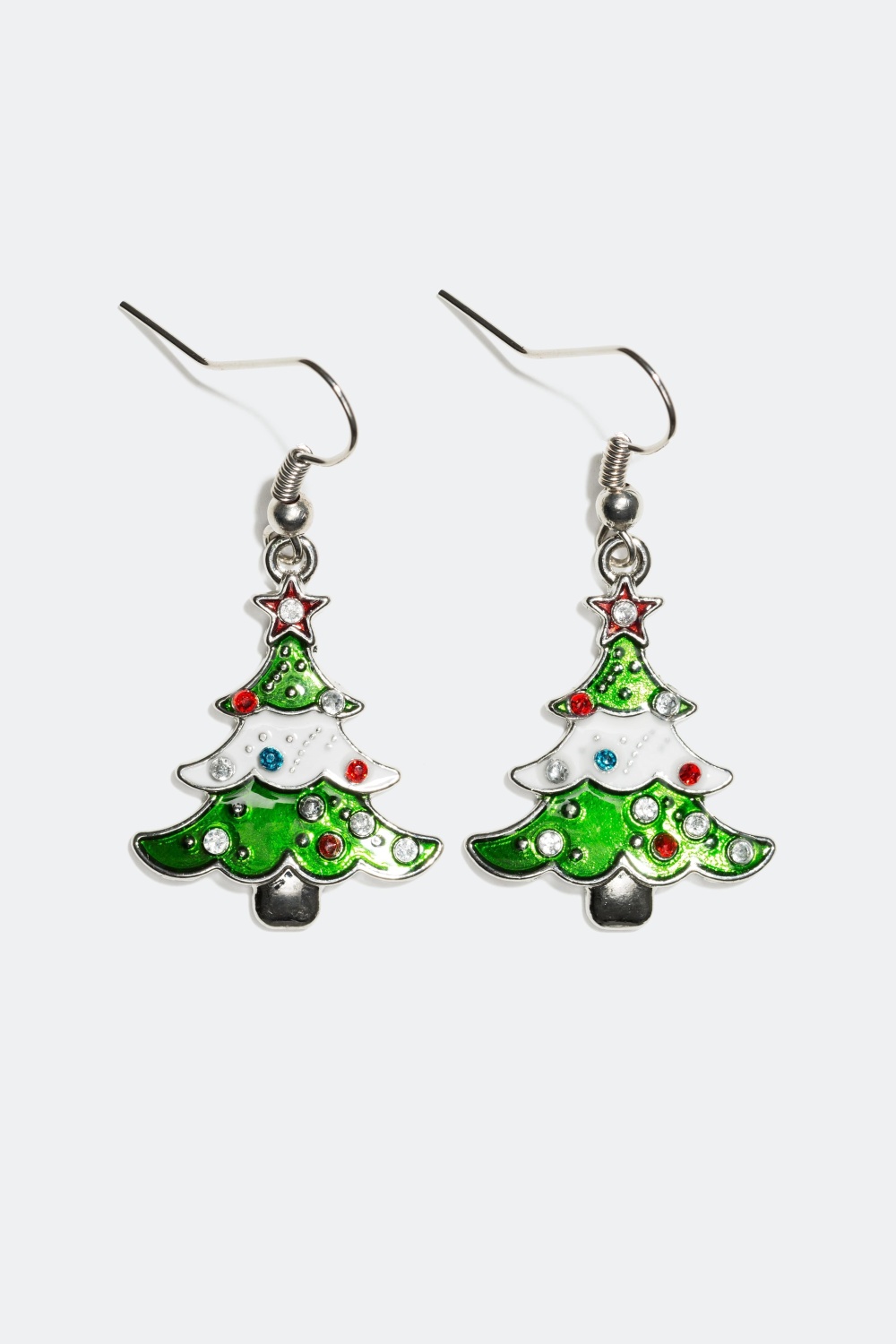 Julgranörhängen, metall - Ett par metallörhängen med ett julgranhänge. Julgranen är dekorerad med små glasstenar i olika färger.
