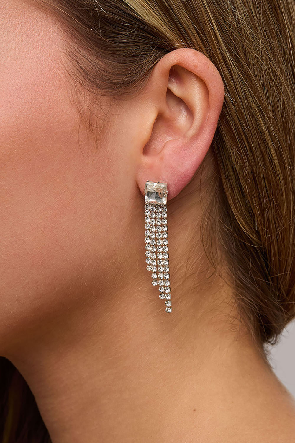 Örhängen med rektangulära större glasstenar och hängande strasslänkar.