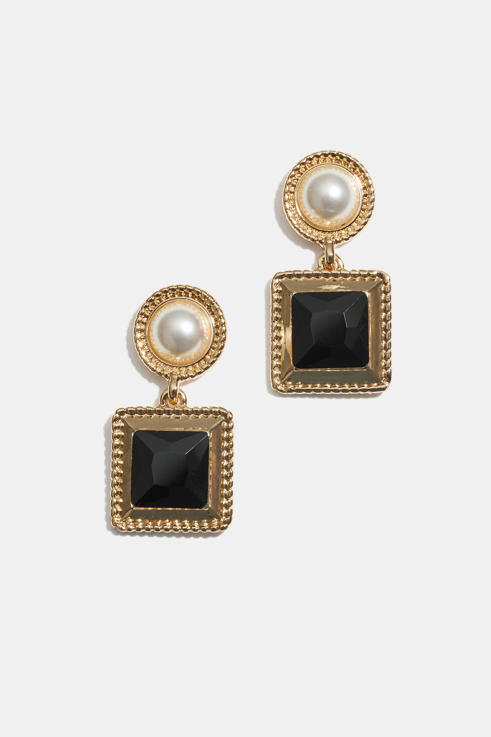 Guldfärgade örhängen med en rund vit pärla och en hängande kvadratisk svart pärla i akryl