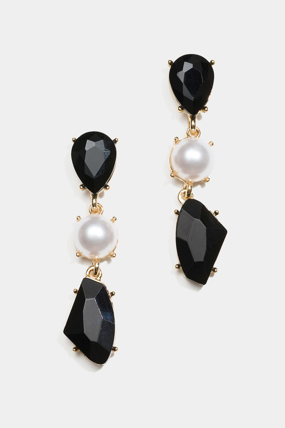 Örhängen i guldfärgad metall med två svarta glasstenar och en rund vit pärla.