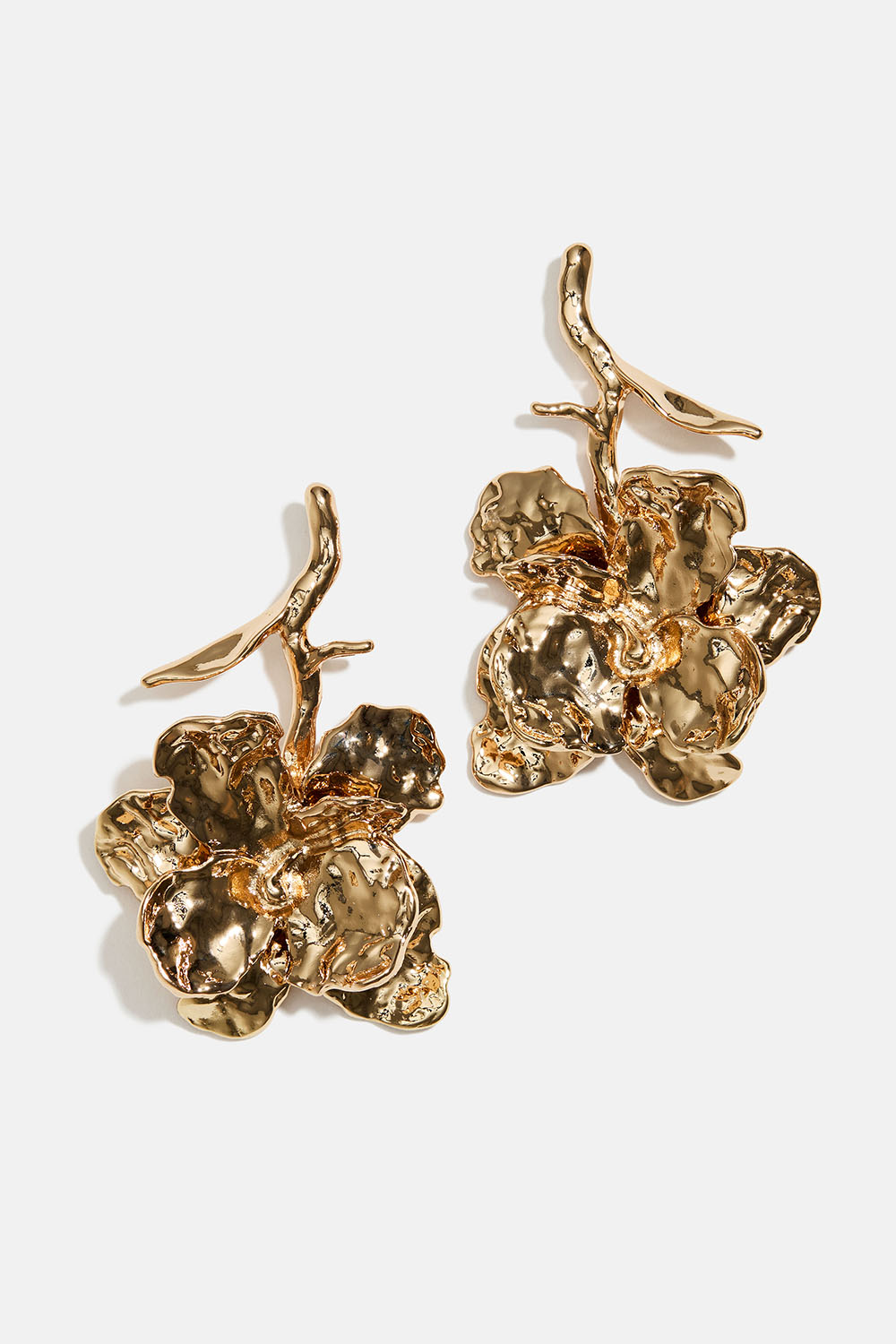 Stora örhängen med uppochner vända blommor i hamrad textur.
