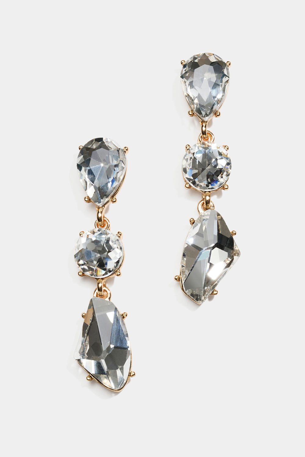 Örhängen i guldfärgad metall med tre hängande vita glasstenar i olika former.