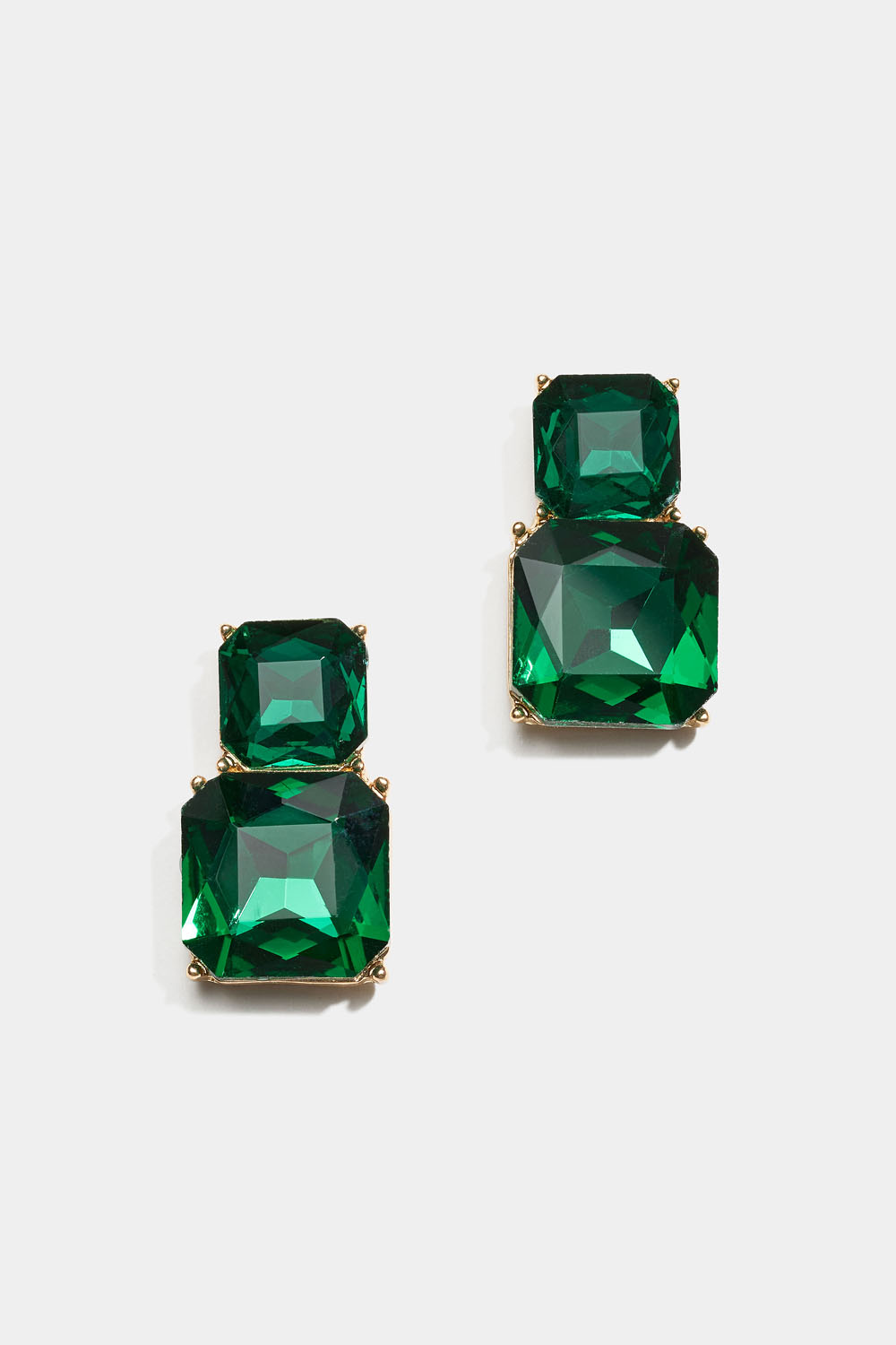 Studs i guldfärgad metall med två kvadratiska gröna glasstenar i olika storlek.