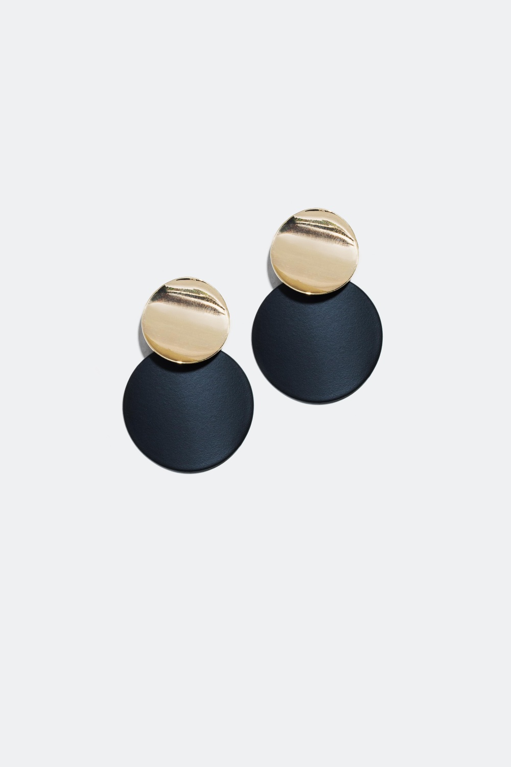 Stilrena örhängen i form av två hängande runda brickor varav den över är i färgen guld och den undre i mattsvart.