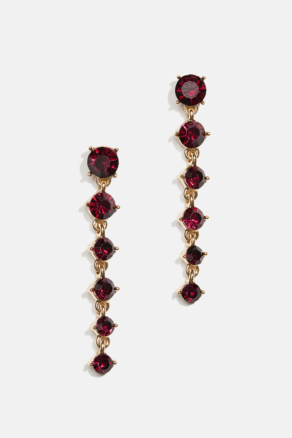 Örhängen i guldfärgad metall med runda vinröda glasstenar i fallande storlek.