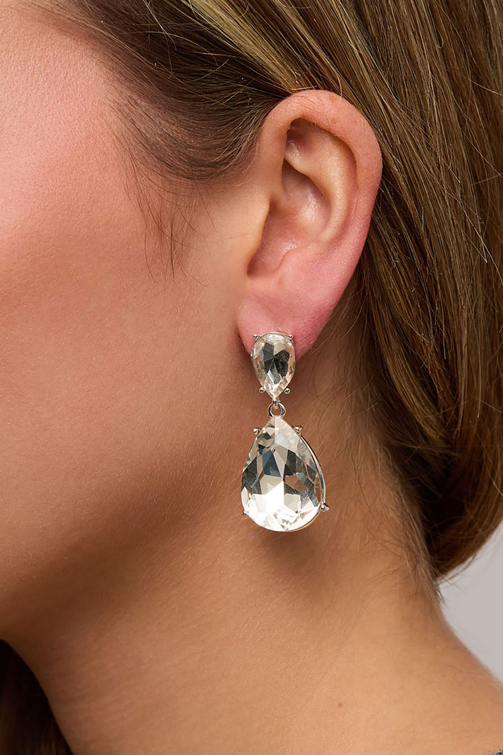 Örhängen i silverfärgad metall med en liten droppformad glassten och en hängande stor droppformad glassten.