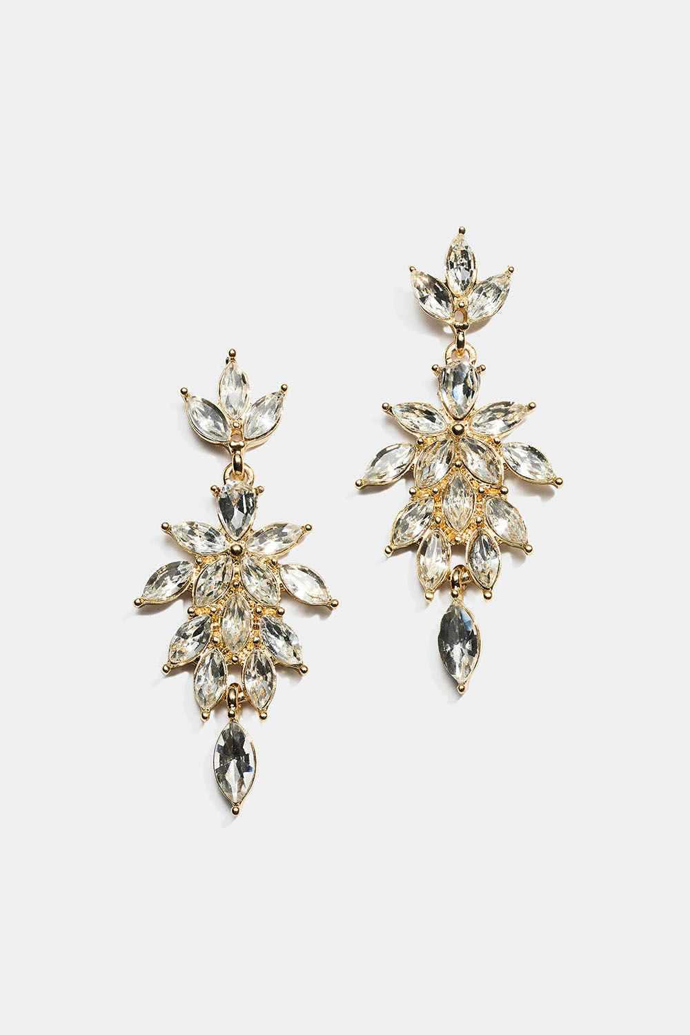 Örhängen i guldfärgad metall med vita droppformade glasstenar i kluster.
