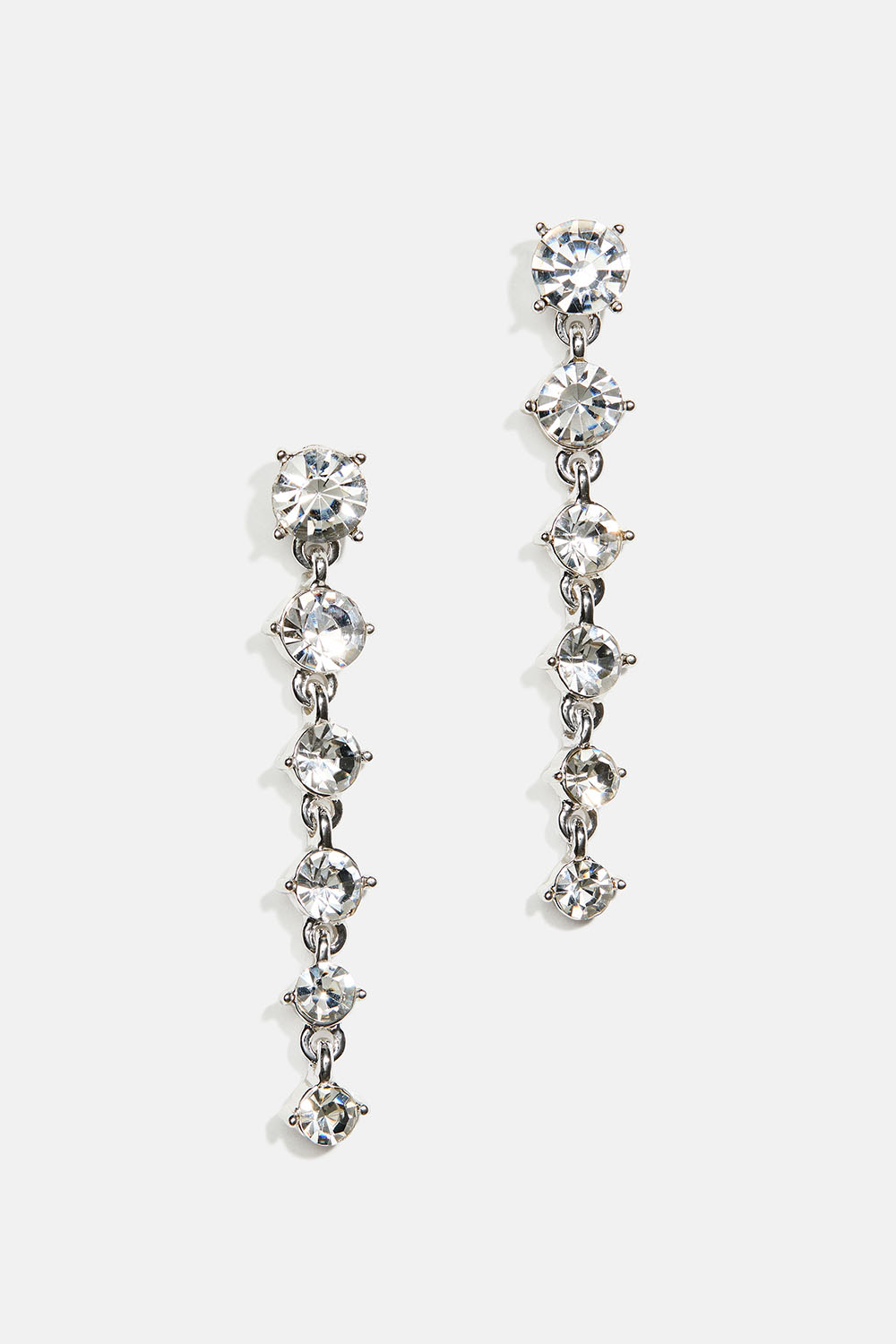 Örhängen i silverfärgad metall med runda vita glasstenar i fallande storlek.