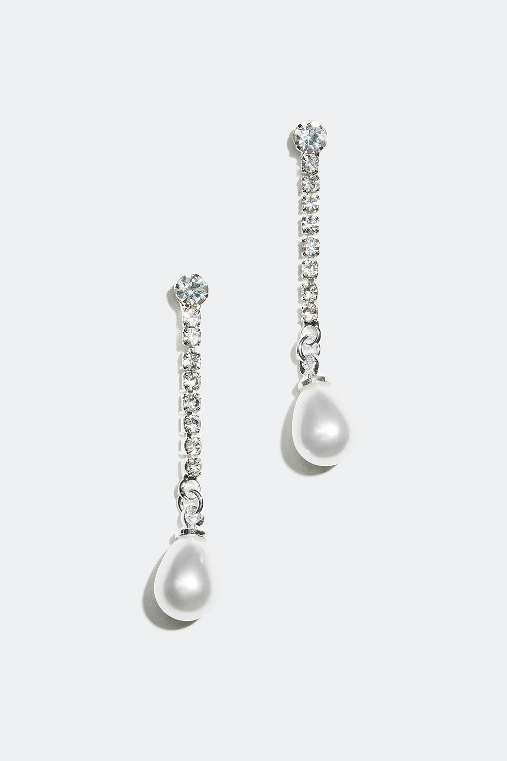 Örhängen med hängande strasslänk av glasstenar samt en droppformad vit pärla längst ned.