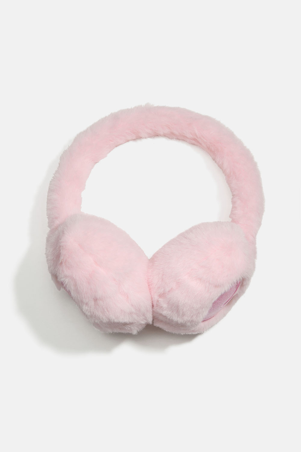 Öronmuffar i fluffigt rosa tyg med glittriga hjärtan.