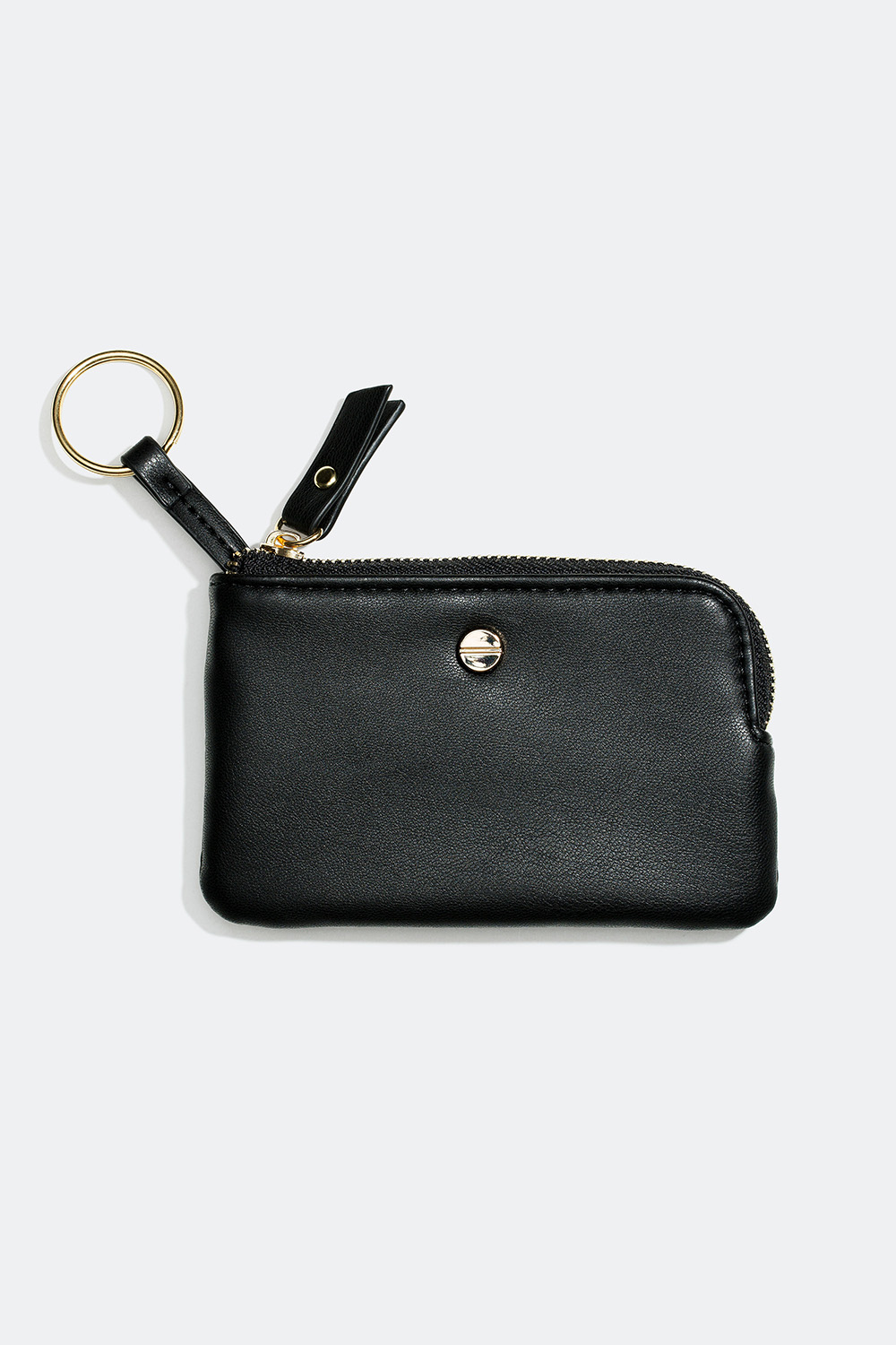 Svart plånbok/portmonnä med guldfärgade detaljer. Plånboken stängs med en dragkedja och har ett extra fack samt en nyckelring som är fastsydd på insidan.