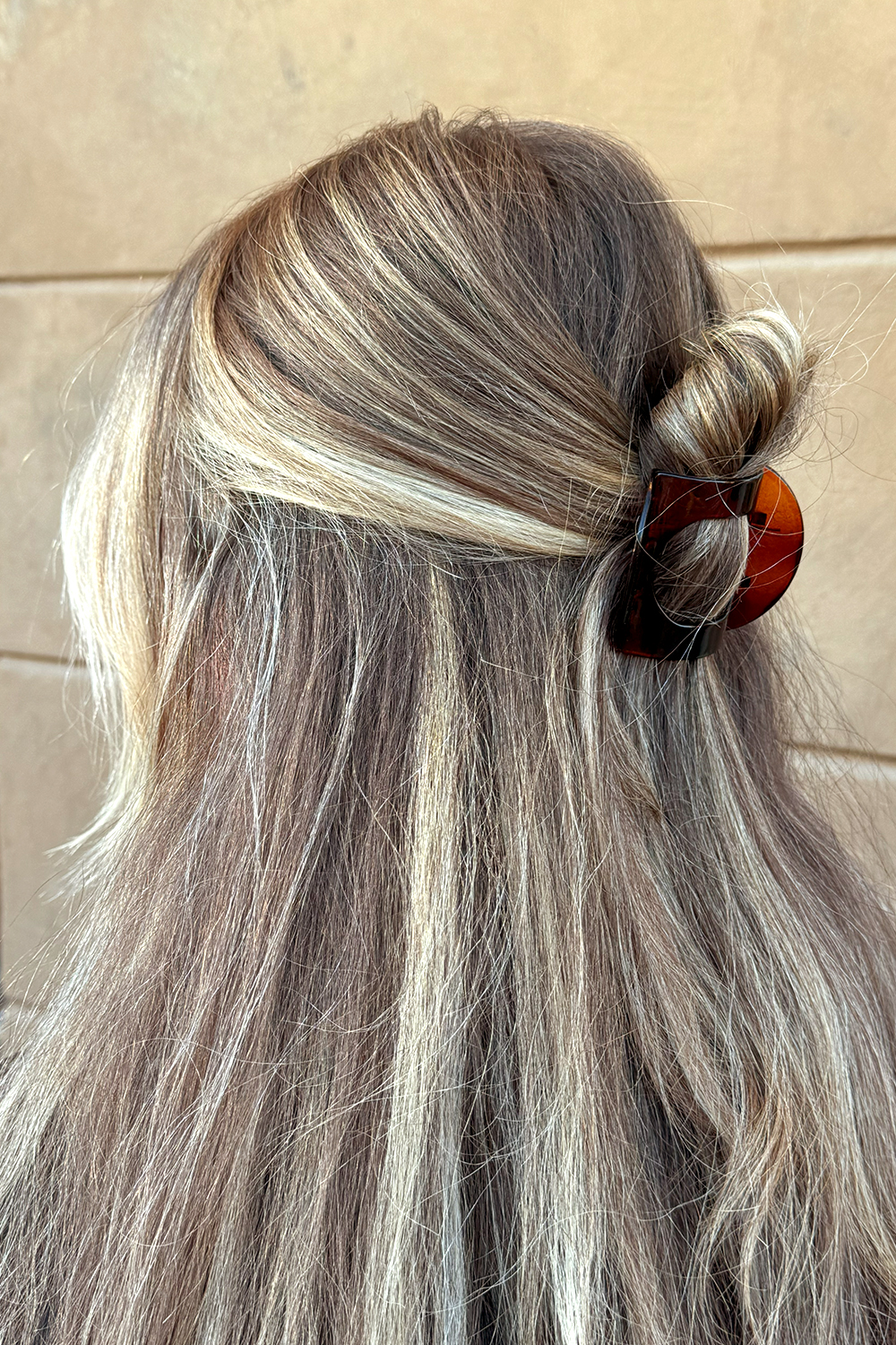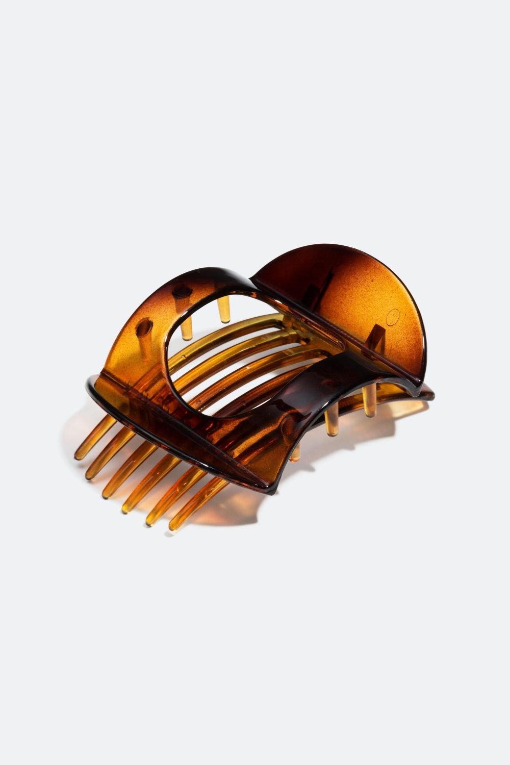 Denna klämma är perfekt när du vill sätta upp håret snabbt. Klämman har en design som följer formen på bakhuvudet, vilket gör att den sitter skönt i håret. Du kan luta dig tillbaka t.ex. i bilen eller i soffan utan att något sticker i bakhuvudet. Du fäster klämman ifrån sidan och är mycket lätt att använda. På insidan av klämman sitter piggar som gör att den fäster bra i håret.