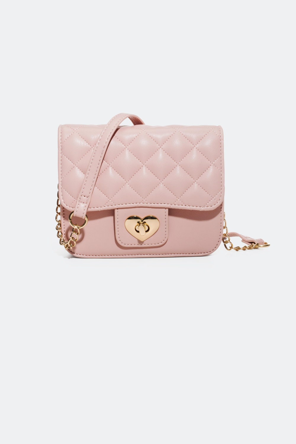 Söt axelremsväska med quiltat lock och guldfärgat hjärtformat lås. Väskan kommer i en ljusrosa färg med ett axelband i form av en guldfärgad kedja med ljusrosa detalj.