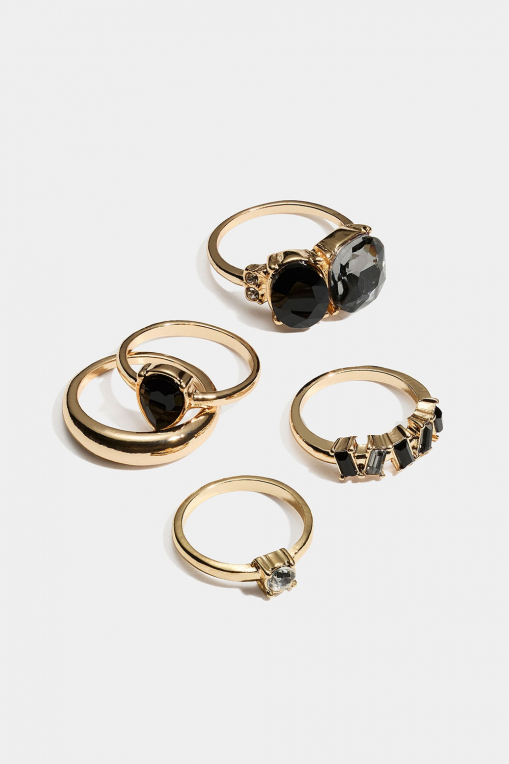 Ringar i guldfärgad metall med olika design, dekorerade med gråa och svarta glasstenar. Kommer i 5-pack