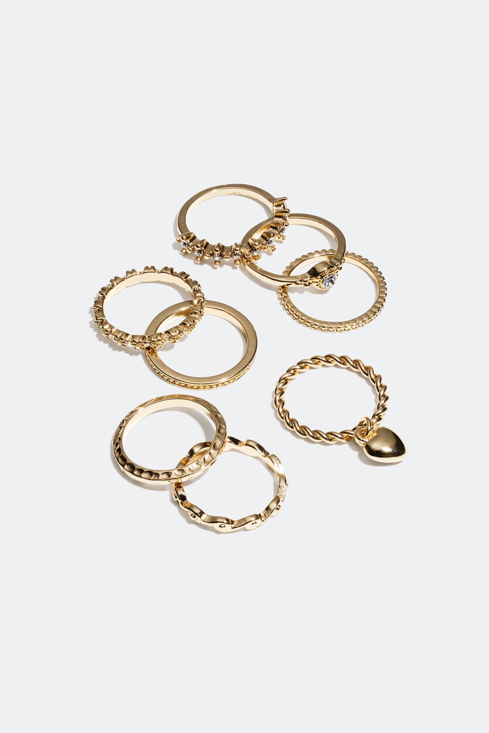 Åtta ringar i olika utföranden. Ringarna har olika former och mönster som hamrade, flätade och blommönster, plus några är dekorerade med diamantfärgade akrylstenar. Finns i både guld och silver.