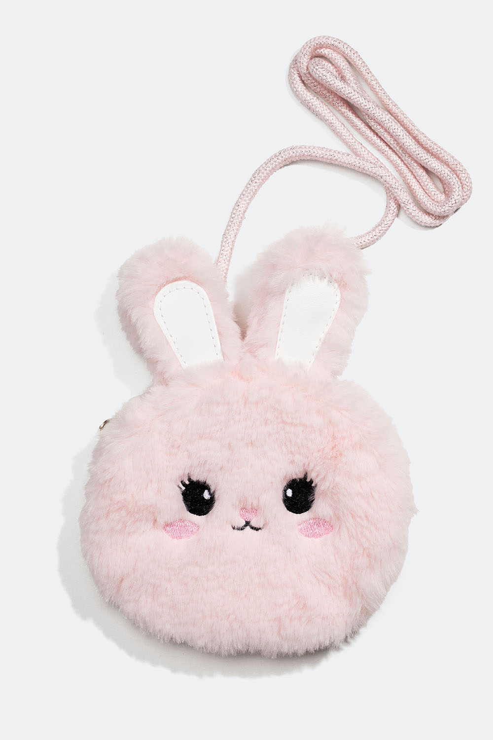Väska med fluffigt tyg och axelrem - Söt väska med fluffigt rosa tyg utsmyckad med en illustration i form av ett kaninansikte och två kaninöron. Väskan stängs med en rosa dragkedja och har en axelrem i rosa glittrigt rep.