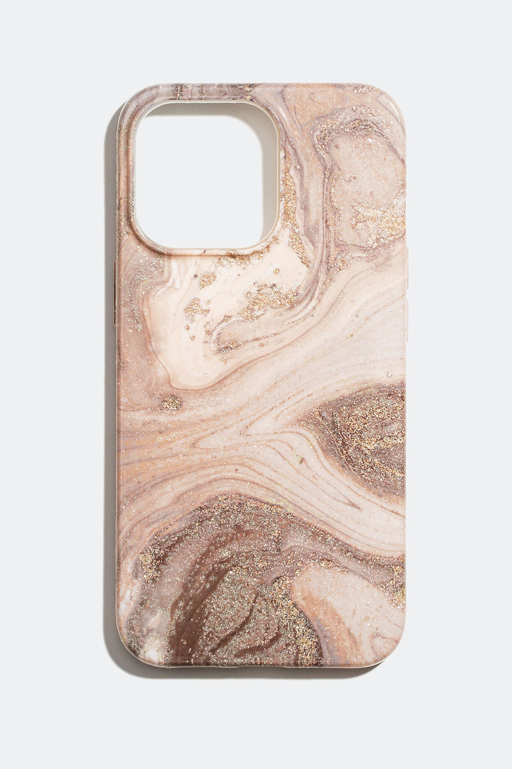 Rosa marmormönstrat mobilskal för iPhone 13 PRO i hårdplast med skimrande detaljer. Hjälper att skydda mobilens baksida mot repor och damm och har öppningar för kamera, högtalare och laddare.