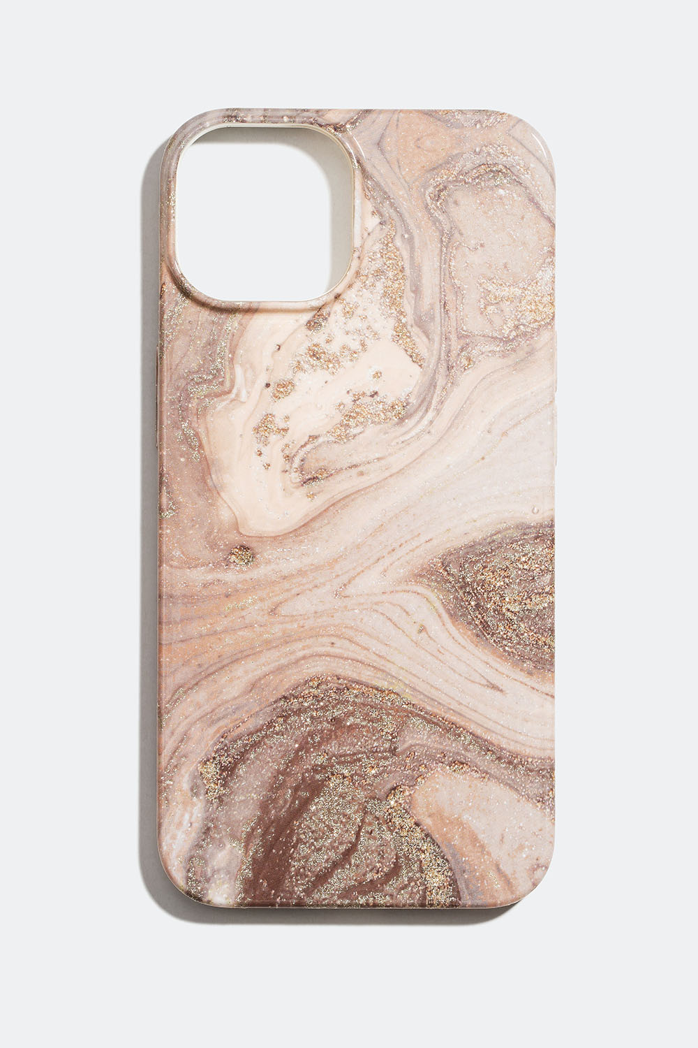 Rosa marmormönstrat mobilskal för iPhone 14 i hårdplast med skimrande detaljer. Hjälper att skydda mobilens baksida mot repor och damm och har öppningar för kamera, högtalare och laddare.